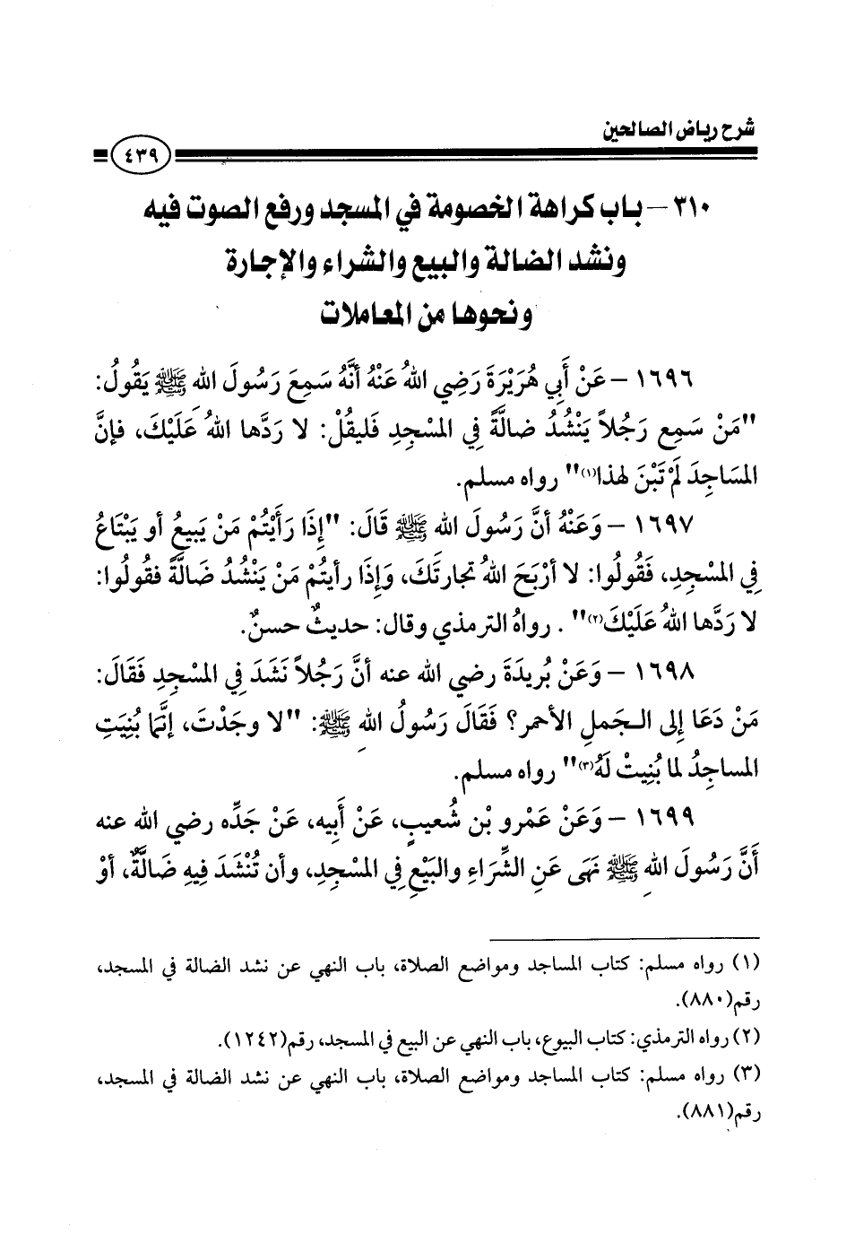 1699 - وعن عمرو بن شعيب عن أبيه عن جده رضي الله عنه أن رسول الله صلى الله عليه وسلم نهى عن الشراء والبيع في المسجد وأن تنشد فيه ضالة أو
