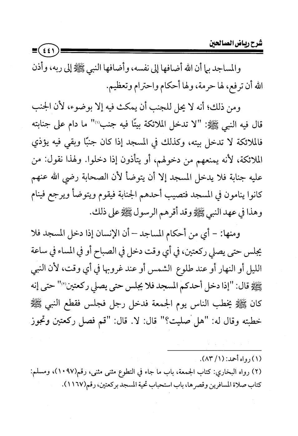 والمساجد بما أن الله أضافها إلى نفسه وأضافها النبي صلى الله عليه وسلم إلى ربه وأذن الله أن ترفع لها حرمة ولها أحكام واحترام وتعظيم ومن ذلك أنه لا يحل للجنب أن يمكث فيه إلا بوضوء لأن الجنب قال فيه النبي صلى الله عليه وسلم لا تدخل الملائكة بيتا فيه جنب مادام على جنابته فالملائكة لا تدخل بيته وكذلك في المسجد إذا كان جنبا وبقى فيه يؤذي الملائكة لأنه يمنعهم من دخوله أو يتأذون إذا دخلوا ولهذا نقول من عليه جنابة فلا يدخل المسجد إلا أن يتوضأ واستثنينا الوضوء لأن الصحابة رضي الله عنهم كانوا ينامون في المسجد فتصيب أحدهم الجنابة فيقوم ويتوضأ ويرجع فينام وهذا في عهد النبي صلى الله عليه وسلم وقد أقرهم الرسول صلى الله عليه وسلم على ذلك ومنها أي من أحكام المساجد أن الإنسان إذا دخل المسجد فلا يجلس حتى يصلي ركعتين لا يجلس حتى يصلي ركعتين في أي وقت دخل في الصباح في المساء في الليل في النهار عند طلوع الشمس عند غروبها في أي وقت لأن النبي صلى الله عليه وسلم قال إذا دخل أحدكم المسجد يجلس حتى يصلي ركعتين حتى إنه كان صلى الله عليه وسلم يخطب الناس يوم الجمعة فدخل رجل فجلس فقطع النبي صلى الله عليه وسلم خطبته وقال له هل صليت قال لا قال قم فصل ركعتين وتجوز