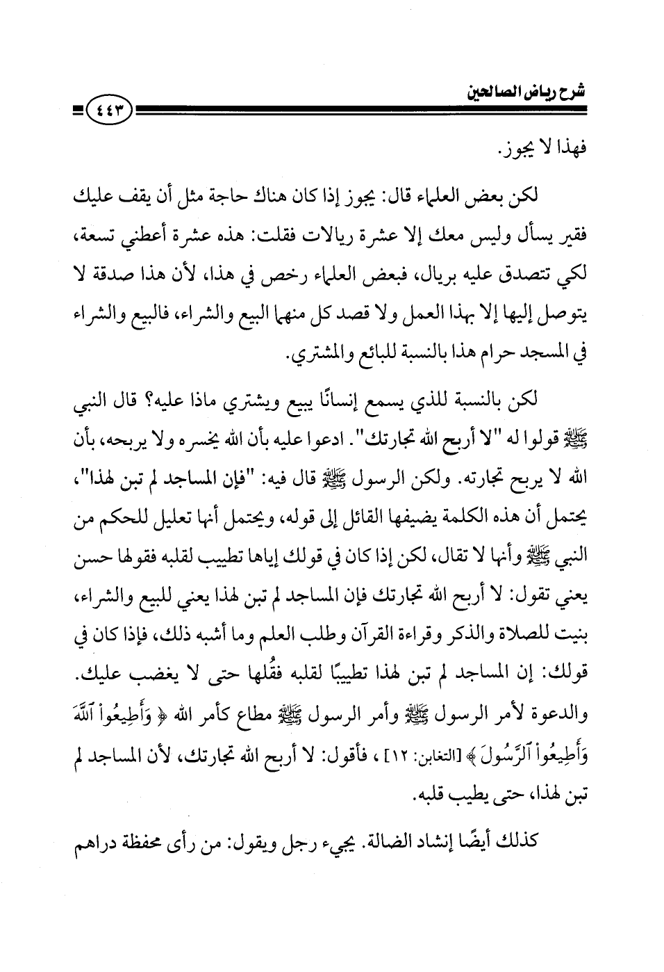 فهذا لا يجوز لكن بعض العلماء قال يجوز إذا كان هناك حاجة مثل أن يقف عليك فقير يشحذ وليس معك إلا عشرة ريالات فقلت هذه عشرة أعطني تسعة لكي تتصدق عليه بريال بعض العلماء رخص في هذا لأن هذا صدقة لا يتوصل إليها إلا بهذا العمل ولا قصد كل منهما البيع والشراء فالبيع والشراء في المسجد حرام هذا بالنسبة للبائع والمشتري لكن بالنسبة للذي يسمع إنسانا يبيع ويشتري ماذا عليه قال النبي صلى الله عليه وسلم قولوا له لا أربح الله تجارتك ادعوا عليه بأن الله يخسره ولا يربحه بأن الله لا يربح تجارته ولكن الرسول صلى الله عليه وسلم قال فيه فإن المساجد لم تبن لهذا يحتمل أن هذه الكلمة يضيفها القائل إلى قوله ويحتمل أنها تعليل للحكم من النبي صلى الله عليه وسلم وأنها لا تقال لكن إذا كان في قولك إياها تطييب لقلبه فهذا قولها حسن يعني تقول لا أربح الله تجارتك فإن المساجد لم تبن لهذا يعني للبيع والشراء ما بنيت للبيع والشراء بنيت للصلاة والذكر وقراءة القرآن وطلب العلم وما أشبه هذا فإذا كان في قولك إن المساجد لم تبن لهذا تطييب لقلبه فقلها حتى لا يغضب عليك أنا إذا دعوت عليك فقد دعوت عليك لأمر من الرسول صلى الله عليه وسلم وأمر الرسول صلى الله عليه وسلم مطاع كأمر الله {وَأَطِيعُوا اللهَ وَأَطِيعُوا الرَّسُولَ} فأقول لا أربح الله تجارتك فإن المساجد لم تبن لهذا حتى يطيب قلبه كذلك أيضا إنشاد الضالة يجيء رجل ويقول ضاع مني كذا مثل محفظة الدراهم