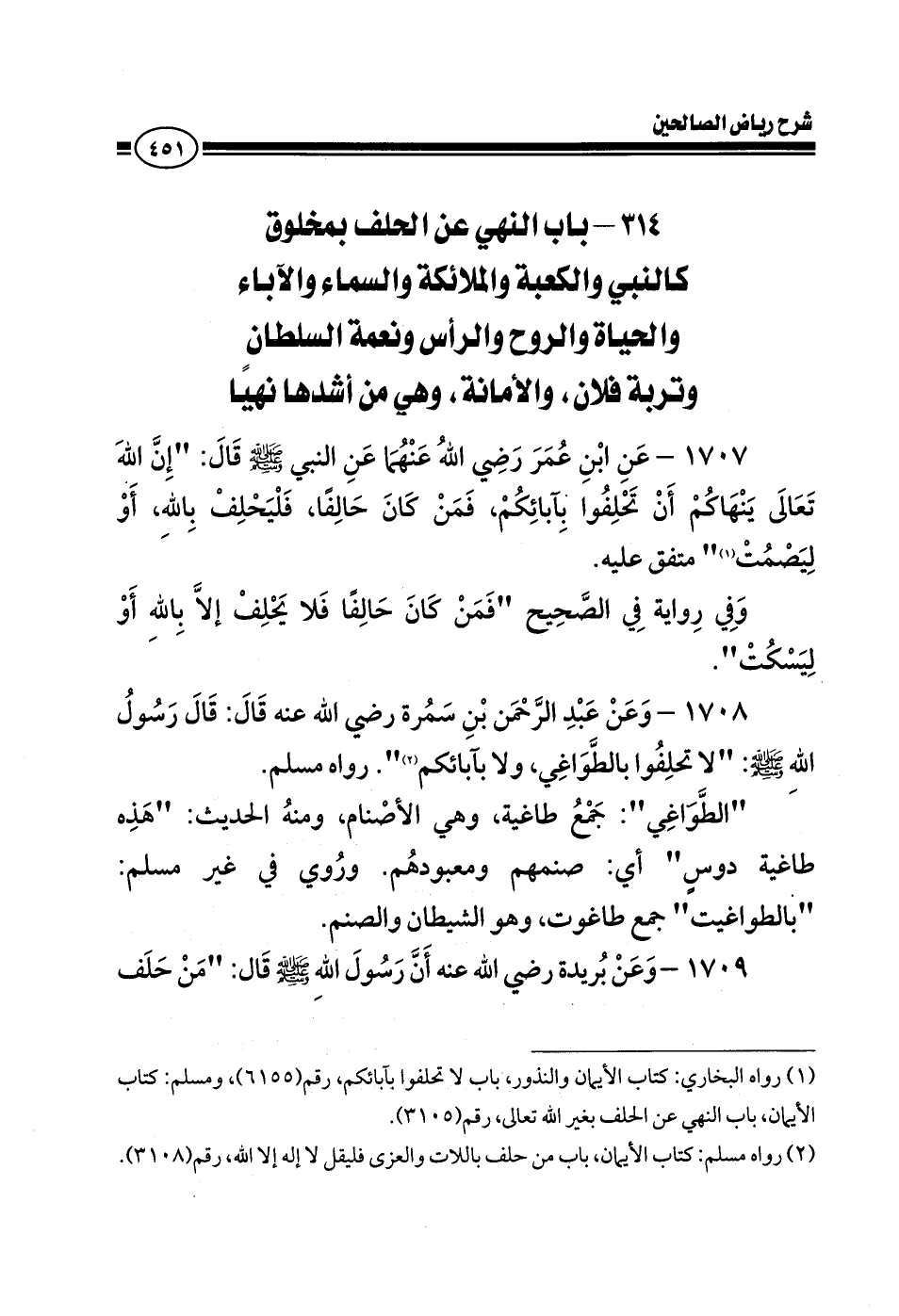 1708 - وعن عبد الرحمن بن سمرة رضي الله عنه قال: قال رسول الله صلى الله عليه وسلم: لا تحلفوا بالطواغي ولا بآبائكم رواه مسلم الطواغي جمع طاغية وهي الأصنام ومنه الحديث هذه طاغية دوس أي: صنمهم ومعبودهم وروي في غير مسلم بالطواغيت جمع طاغوت وهو الشيطان والصنم