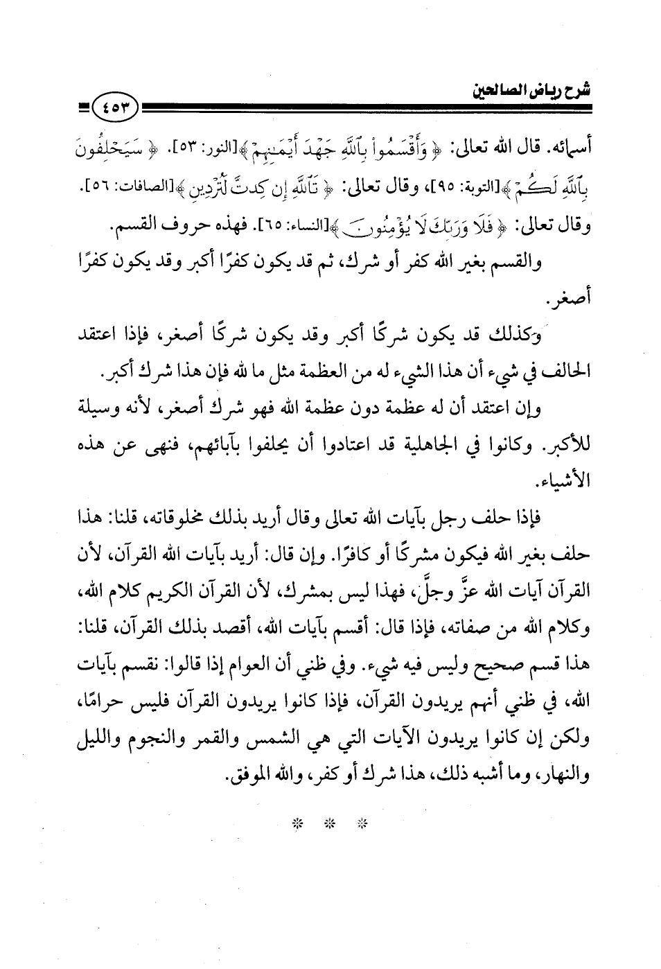 أو أي اسم من أسماء الله فهذا جائز وحروف القسم ثلاثة الواو والباء والتاء الواو مثل والله لأفعلن كذا والباء مثل بالله لأفعلن كذا والتاء تالله لأفعلن كذا قال الله تعالى {وَأَقْسَمُوا بِاللهِ جَهْدَ أَيْمَانِهِمْ} {يَحْلِفُونَ بِاللهِ لَكُمْ لِيُرْضُوكُمْ} وقال تعالى {تَاللهِ إِن كِدتَّ لَتُرْدِينِ} وقال تعالى {فَلاَ وَرَبِّكَ لاَ يُؤْمِنُونَ} فهذه حروف القسم والقسم بغير الله كفر أو شرك ثم قد يكون كفرا أكبر وقد يكون كفرا أصغر وكذلك قد يكون شركا أكبر وقد يكون شركا أصغر فإذا اعتقد الحالف في شيء أن هذا الشيء له من العظمة مثل ما لله فإن هذا شرك أكبر وإن اعتقد أن له عظمة دون عظمة الله فهو شرك أصغر لأنه وسيلة للأكبر وكانوا في الجاهلية قد اعتادوا أن يحلفوا بآبائهم فنهى النبي صلى الله عليه وسلم عنه وقال لا تحلفوا بآبائكم يعني ولا بإخوانكم ولا بأجدادكم ولا برؤسائكم لكن خص الآباء بالذكر لأن هذا هو المعتاد عندهم من كان حالفا فليحلف بالله أو ليسكت يعني إما ليحلف بالله أو لا يحلف أما أن يحلف بغير الله فلا ومن ذلك الحلف بالنبي محمد صلى الله عليه وسلم أشرف البشر وسيد البشر لو قلت والنبي محمد كنت مشركا أو كافرا الحلف بجبريل لو قلت وجبريل وميكائيل وإسرافيل ومالك خازن النار أو غير هؤلاء فهذا شرك لو قلت والشمس والقمر والليل والنهار تحلف بها فهذا شرك إما أكبر وإما أصغر على حسب ما قسمنا وتحلف أيضا بصفة من صفات الله مثل وعزة الله لأفعلن وحكمة الله لأفعلن كذا وكذا لا بأس به أما الحلف بغير الله فهو كما قلت كفر أو شرك إما أكبر وإما أصغر ثم ذكر المؤلف الحديث أن من قال هو بريء من دين الإسلام إن كان كذا وأن الإنسان لا يحل له أن يقول هذا وأنه إن قال هذا فإن كان كاذبا فهو كما قال يعني أنه بريء من الإسلام والعياذ بالله وإن كان صادقا فلن يرجع إلى الإسلام سالما يعني لابد أن يأثم أو يكفر ومثله قول القائل هو يهودي إن حصل كذا وكذا هو نصراني إن حصل كذا وكذا هذا يقال له إن ذلك محرم عليك لأنك إن كنت كاذبا فأنت كما قلت يهودي أو نصراني وإن كنت صادقا فلن ترجع إلى الإسلام سالما مثال ذلك قال رجل إن فلانا قدم اليوم وصل اليوم وكان مسافرا فقال له صاحبه لا ما وصل قال الأول هو يهودي إن كان لم يقدم فإن كان كاذبا وأنه لم يقدم يعني كاذبا فإنه يكن يهوديا لأنه قال هو يهودي إن كان لم يقدم وهو كاذب فيكون بذلك يهوديا وإن كان صادقا أنه قدم فإنه لن يرجع إلى الإسلام سالما كما قال الرسول صلى الله عليه وسلم المهم إنك إذا أردت أن تحلف فاحلف بالله بأي اسم من أسماء الله أو بأي صفة من صفات الله قد يقول قائل أليس الله تعالى أقسم بالمخلوقات قال {وَالشَّمْسِ وَضُحَاهَا} وقال {وَاللَّيْلِ إِذَا يَغْشَاهَا} وقال {وَالسَّمَاءِ وَمَا بَنَاهَا} نقول إن الله تعالى له أن يحلف بما شاء من خلقه فهو إذا حلف بشيء كان ذلك دليلا على عظمة الله لأن عظم المخلوق يدل على عظم الخالق والله تعالى لا يحلف بشيء إلا بشيء عظيم وعظم المخلوق من عظم الخالق ولله أن يحلف بما شاء من خلقه ولا أحد يحجر على الله يفعل ما يريد عز وجل فإن قال القائل نسمع بعض الناس تقول أقسم بآيات الله هل هذا حلف بغير الله وهل هذا كفر أو شرك نقول ماذا يريد بآيات الله إن أراد بآيات الله الشمس والقمر والليل والنهار فهذا حلف بغير الله فيكون مشركا أو كافرا لأن الله يقول {وَمِنْ آيَاتِهِ اللَّيْلُ وَالنَّهَارُ وَالشَّمْسُ وَالْقَمَرُ} فإذا قال أنا أريد بآيات الله التي حلفت بها هذه الأشياء قلنا هذا حلف بغير الله فيكون مشركا أو كافرا وإن قال أريد بآيات الله القرآن لأن القرآن آيات الله عز وجل فهذا ليس بمشرك لماذا لأن القرآن الكريم كلام الله وكلام الله تعالى من صفاته فإذا قال أقسم بآيات الله أقصد بذلك القرآن قلنا هذا قسم صحيح وليس فيه شيء وفي ظني أن العوام إذا قال أقسم بآيات الله في ظني أنهم يريدون القرآن فإذا كانوا يريدون القرآن فليس حراما ولكن إن كانوا يردون الآيات التي هي الشمس والقمر والنجوم والليل والنه