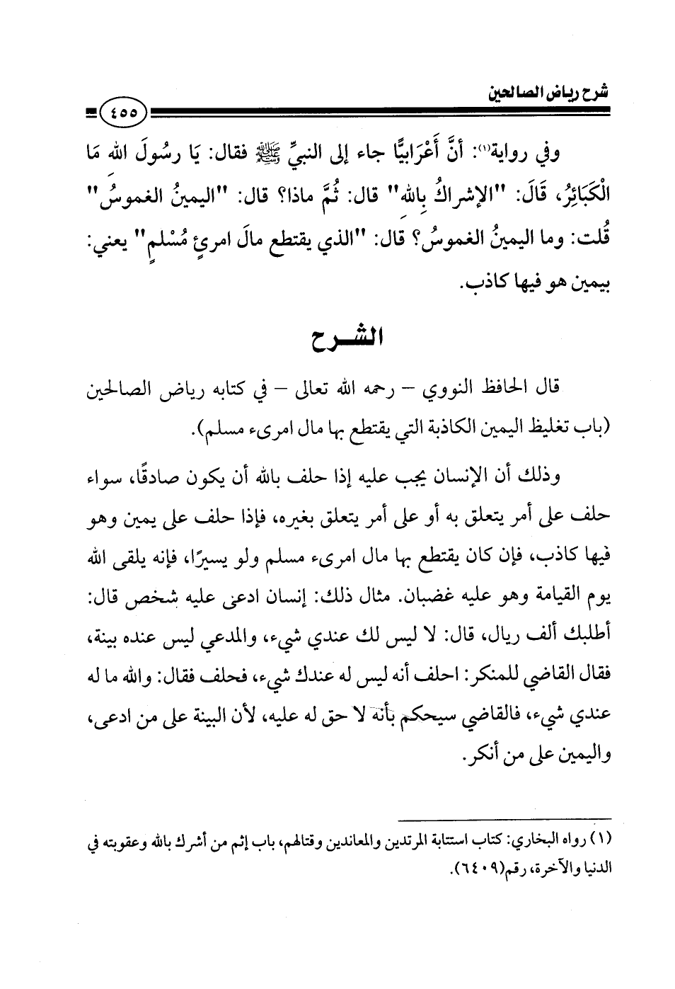 EXقال المؤلف رحمه الله تعالى في كتابه رياض الصالحين باب تغليظ اليمين الكاذبة التي يقتطع بها مال امرئ مسلم وذلك أن الإنسان يجب عليه إذا حلف بالله أن يكون صادقا سواء حلف على أمر يتعلق به أو على أمر يتعلق بغيره فإن حلف على يمين وهو فيها كاذب فإن كان يقتطع بها مال امرئ مسلم ولو يسيرا فإنه يلقى الله يوم القيامة وهو عليه غضبان مثال ذلك إنسان ادعى عليه شخص قال أنا أعطيتك ألف ريال قال لا ليس لك عندي شيء والمدعي ليس عنده بينة فقال القاضي للمنكر احلف أنه ليس له عندك شيء فحلف فقال والله ما له عندي شيء القاضي سيحكم بأنه لا حق له عليه لأن البينة على من أدعى واليمين على من أنكر