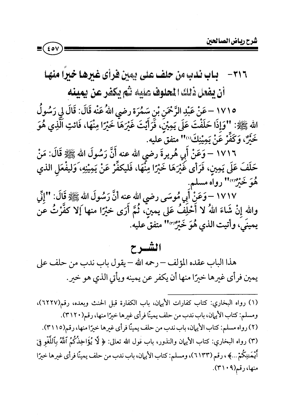 EXهذا الباب عقده المؤلف رحمه الله في كتابه رياض الصالحين يقول باب ندب من حلف على يمين فرأى غيرها خيرا منها أن يكفر عن يمينه ويأتي الذي هو خير