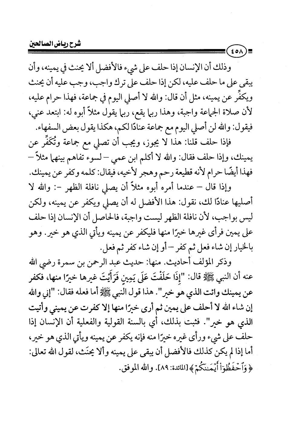 وذلك أن الإنسان إذا حلف على شيء فالأفضل ألا يحنث في يمينه أن يبقى على ما حلف عليه لكن إذا حلف على ترك واجب وجب عليه أن يحنث ويكفر مثل أن قال والله لا أصلي اليوم في جماعة هذا حرام عليه صلاة الجماعة واجبة وهذا ربما يقع ربما يقول مثلا أبوه له يا ولد روح صلي يقول والله اليوم ما أصلي مع جماعة عنادا لكم هكذا يقول بعض السفهاء فإذا حلف قلنا هذا لا يجوز لازم تصلي مع جماعة وتكفر عن يمينك وإذا حلف فقال والله لا أكلم ابن عمي لسوء تفاهم بينهما مثلا هذا أيضا حرام لأنه قطيعة رحم وهجر لأخيه فيقال كلمه وكفر عن يمينك وإذا قال عندما أمره أبوه مثلا أن يصلي نافلة الظهر قال والله ما أصليها عنادا لك نقول هذا الأفضل أن يصلي ويكفر عن يمينه ولكن ليس بواجب لأن نافلة الظهر ما هي واجبة فالحاصل أن الإنسان إذا حلف على يمين فرأى غيرها خيرا منها فليكفر عن يمينه ويأتي الذي هو خير وهو بالخيار إن شاء فعل ثم كفر أو إن شاء كفر ثم فعل وذكر المؤلف أحاديث منها حديث عبد الرحمن بن سمرة رضي الله عنه أن النبي صلى الله عليه وسلم قال إذا حلفت على يمين فرأيت غيرها خيرا منها فكفر عن يمينك وأت الذي هو خير هذا قول النبي صلى الله عليه وسلم أما فعله فقال: والله إن شاء الله إني لا أحلف على يمين فأرى غيرها خيرا منها إلا كفرت عن يميني وأتيت الذي هو خير فثبت بذلك أي بالسنة القولية والفعلية أن الإنسان إذا حلف على شيء ورأى غيره خيرا منه فإنه يكفر عن يمينه ويأتي الذي هو خير أما إذا لم يكن كذلك فالأفضل أن يبقى على يمينه وألا يحنث لقول الله تعالى واحفظوا أيمانكم والله الموفق