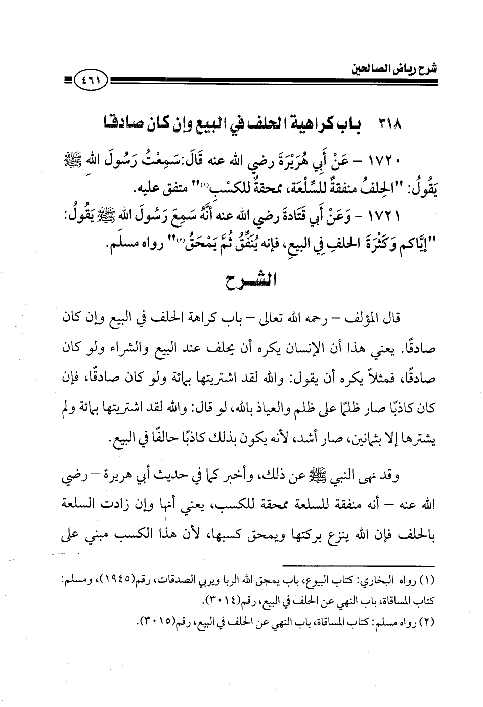 EXقال المؤلف رحمه الله في كتابه رياض الصالحين باب كراهة الحلف في البيع وإن كان صادقا يعني معنى هذا أن الإنسان يكره أن يحلف عند البيع والشراء ولو كان صادقا فمثلا يكره أن يقول والله لقد اشتريتها بمائة ولو كان صادقا فإن كان كاذبا صار ظلما على ظلم والعياذ بالله لو قال والله لقد اشتريتها بمائة ولم يشترها إلا بثمانين صار أشد لأنه يكون بذلك كاذبا حالفا في البيع وقد نهى النبي صلى الله عليه وسلم عن ذلك وأخبر كما في حديث أبي هريرة أنه منفقة للسلعة ممحقة للكسب يعني أنها وإن زادت السلعة بالحلف فإن الله ينزع بركتها ويمحق كسبها لأن هذا الكسب مبني على