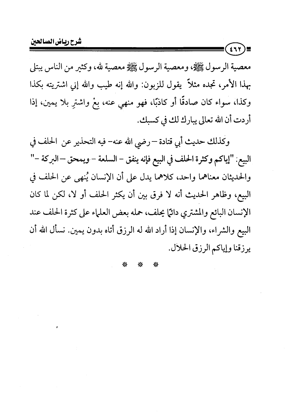 معصية الرسول صلى الله عليه وسلم ومعصية الرسول معصية لله وكثير من الناس يبتلى في هذا الأمر تجده مثلا يقول للزبون والله إنه طيب والله إني اشتريته بكذا وكذا سواء كان صادقا أو كاذبا فهو منهي عنه بيع واشتري بلا يمين إذا أردت أن الله يبارك لك في كسبك وكذلك حديث أبي قتادة فيه التحذير عن الحلف في البيع إياكم والحلف في البيع فإنه ينفق السلعة ويمحق البركة والحديثان معناهما واحد كلاهما يدل على أن الإنسان ينهى عن الحلف في البيع وظاهر الحديث أنه لا فرق بين أن يكثر الحلف أو لا لكن لما كان الإنسان البائع والمشتري دائما يحلف دائما يبيع ويشتري حمله بعض العلماء على الكثرة كثرة الحلف عند البيع والشراء فالإنسان إذا أراد الله له الرزق أتاه بدون يمين نسأل الله أن يرزقنا وإياكم الرزق الحلال