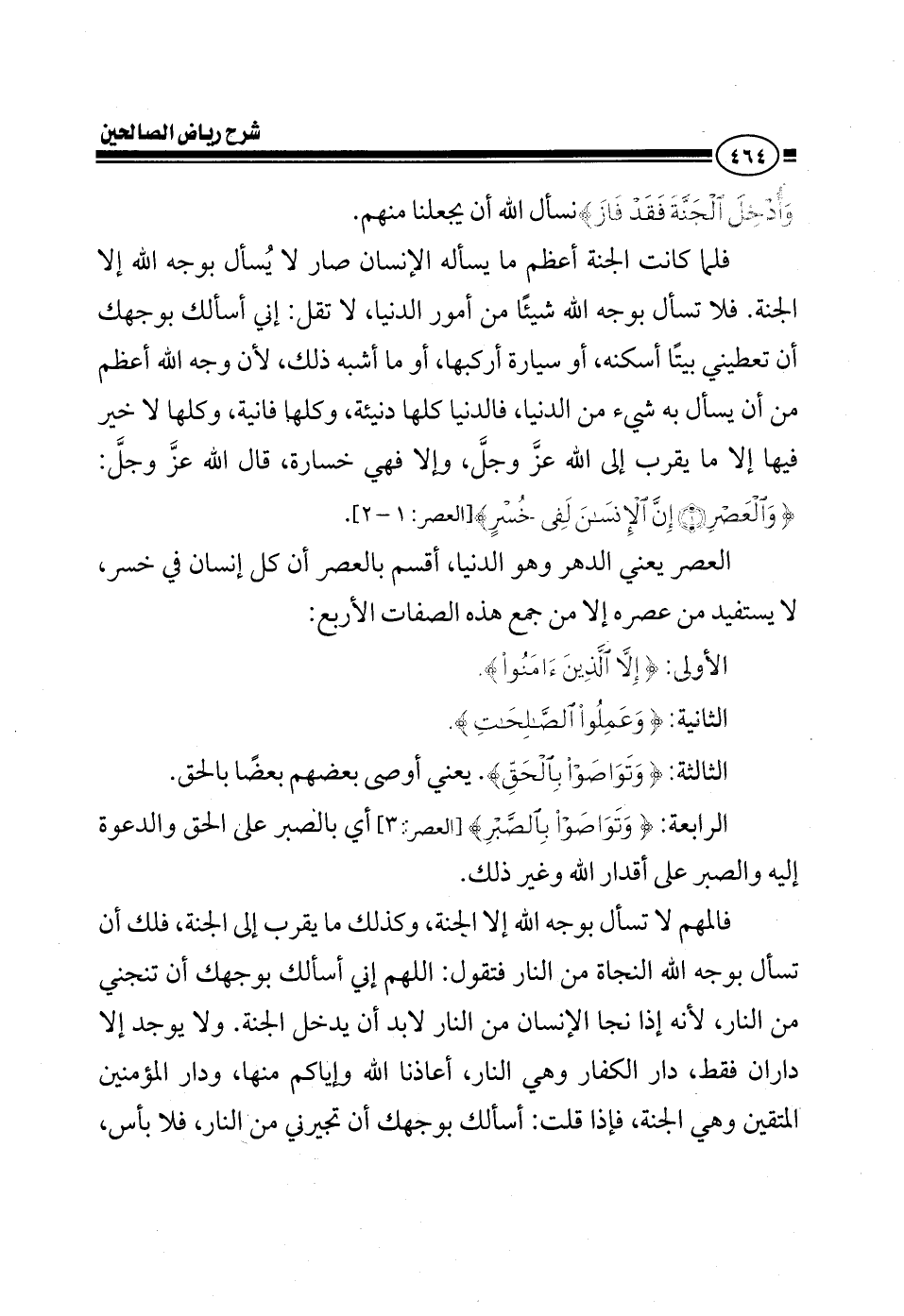 وأدخل الجنة فقد فاز} نسأل الله أن يجعلنا وإياكم منهم فلما كانت الجنة أعظم مسئول يعني مسئول به يعني أعظم ما يسأله الإنسان هو الجنة صار لا يسأل بوجه الله إلا الجنة فلا تسأل بوجه الله شيء من أمور الدنيا لا تقبل الله أني أسألك بوجهك أن تعطيني بيتا أسكنه أو سيارة أركبها أو ما أشبه ذلك لأن وجه الله أعظم من أن يسأل به شيء من الدنيا الدنيا كلها دنيئة كلها فانية كلها لا خير فيها إلا ما يقرب إلى الله عز وجل وإلا فهي خسارة قال تعالى {والعصر إن الإنسان لفي خسر} العصر يعني الدهر وهو الدنيا أقسم بالعصر أن كل إنسان في خسر لا يستفيد من عصره إلا من جمع هذه الصفات الأربع {إلا الذين آمنوا} واحد {وعملوا الصالحات} اثنين {وتواصوا بالحق} ثالث يعني أوصى بعضهم بعضا بالحق والرابع {وتواصوا بالصبر} أي بالصبر على الحق والدعوة إليه والصبر على أقدار الله وغير ذلك فالمهم لا تسأل بوجه الله إلا الجنة وكذلك ما يقرب إلى الجنة، فلك أن تسأل بوجه الله النجاة من النار اللهم إن أسألك بوجهك أن تنجني من النار لأنه إذا نجا الإنسان من النار لابد أن يدخل الجنة ما في ثلاثة دور ما في إلا داران فقط دار الكفار وهي النار أعاذنا الله وإياكم منها ودار المؤمنين المتقين وهي الجنة فإذا قلت أسألك بوجهك أن تجيرني من النار فلا بأس