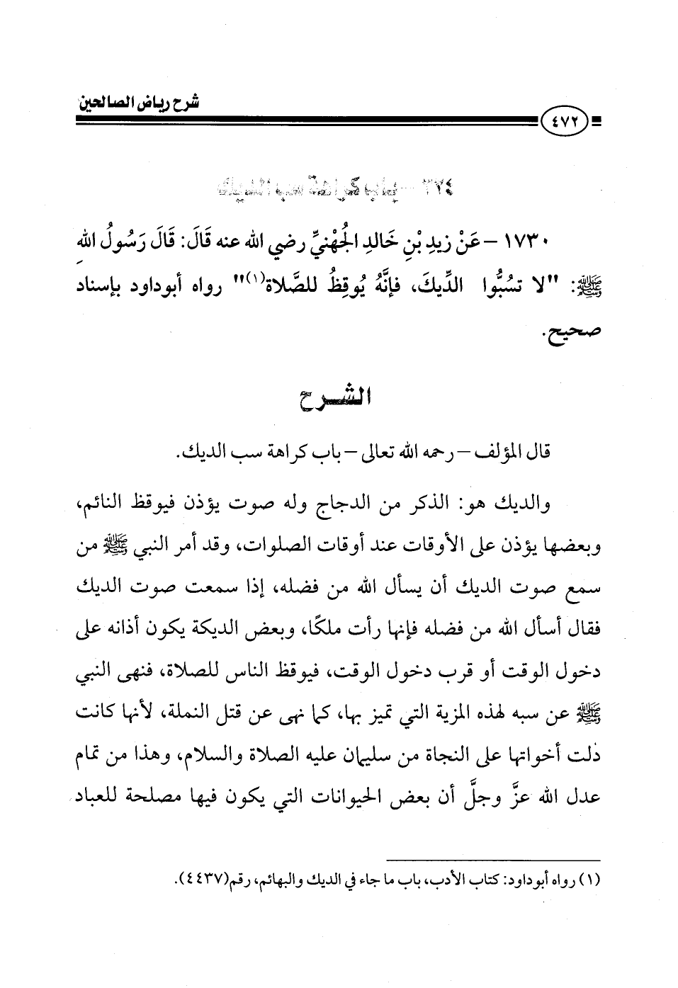 1730 - عن زيد بن خالد الجهني رضي الله عنه قال: قال رسول الله صلى الله عليه وسلم لا تسبوا الديك فإنه يوقظ للصلاة رواه أبو داود بإسناد صحيح
