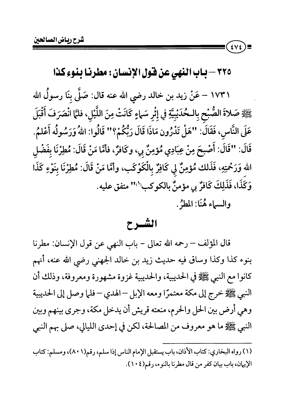 1731 - عن زيد بن خالد رضي الله عنه قال: صلى بنا رسول الله صلى الله عليه وسلم صلاة الصبح بالحديبية في إثر سماء كانت من الليل فلما انصرف أقبل على الناس فقال هل تدرون ماذا قال ربكم قالوا الله ورسوله أعلم قال قال أصبح من عبادي مؤمن بي وكافر فأما من قال مطرنا بفضل الله ورحمته فذلك مؤمن بي كافر بالكوكب وأما من قال مطرنا بنوء كذا وكذا فذلك كافر بي مؤمن بالكوكب متفق عليه والسماء هنا المطر
