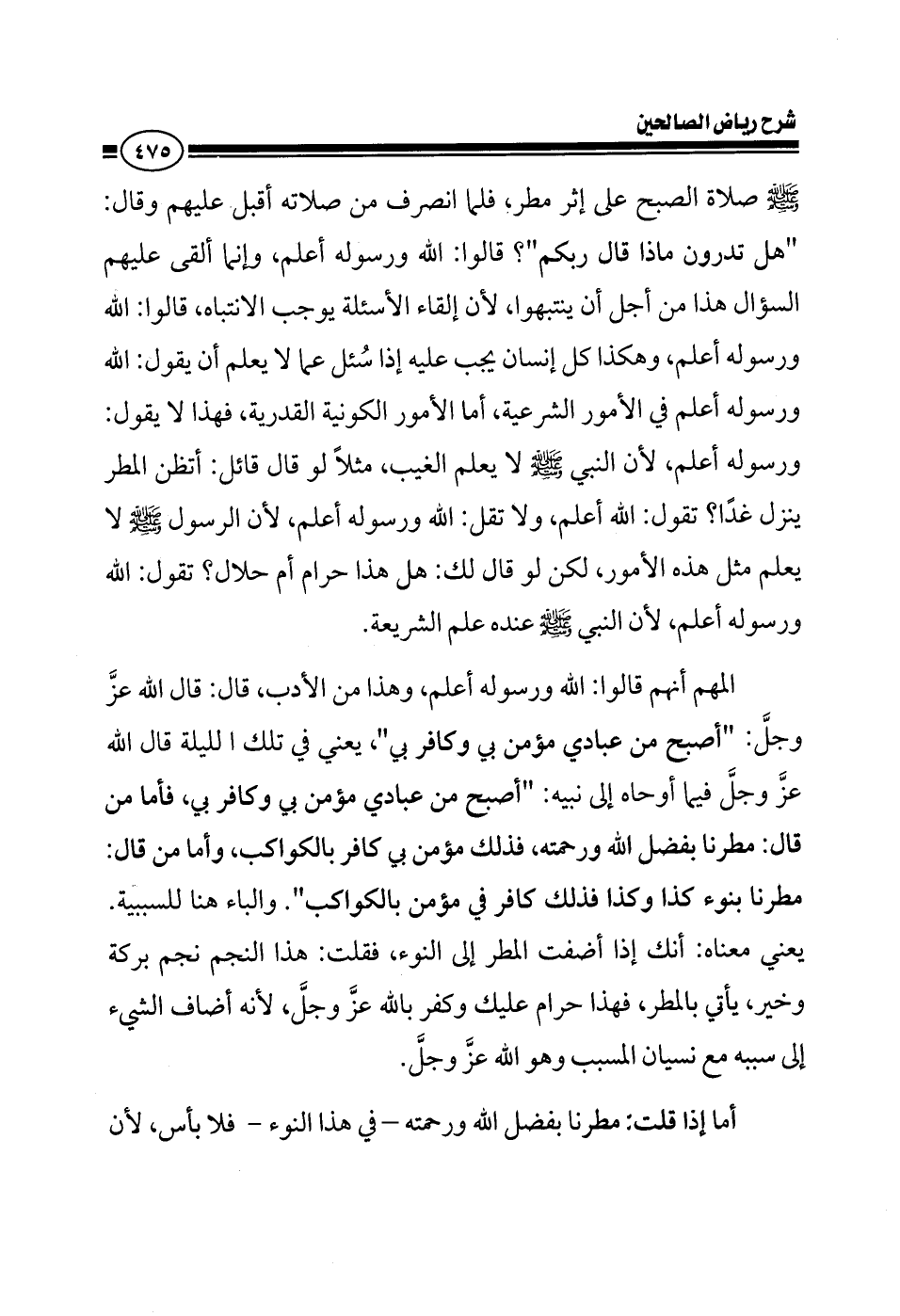 صلى الله عليه وسلم صلاة الصبح على إثر مطر فلما أنصرف من صلاته أقبل عليهم وقال هل تدرون ماذا قال ربكم؟ قالوا الله ورسوله أعلم وإنما ألقى عليهم هذا السؤال من أجل أن ينتبهوا لأن إلقاء الأسئلة يوجب الانتباه قالوا الله ورسوله أعلم وهكذا كل إنسان يجب عليه إذا سئل عما لا يعلم أن يقول الله ورسوله أعلم في الأمور الشرعية أما الأمور الكونية القدرية فهذا لا يقول ورسوله أعلم لأن النبي صلى الله عليه وسلم لا يعلم الغيب كما مثلا لو قال قائل أتظن المطر ينزل غدا تقول الله أعلم ولا تقل الله ورسوله أعلم لأن الرسول صلى الله عليه وسلم لا يعلم مثل هذه الأمور لكن لو قال لك هل هذا حرام أم حلال تقول الله ورسوله أعلم لأن النبي صلى الله عليه وسلم عنده علم الشريعة المهم أنهم قالوا الله ورسوله أعلم وهذا من الأدب قال قال يعني أن الله قال عز وجل أصبح من عبادي مؤمن بي وكافر بي يعني في تلك الليلة قال الله عز وجل فيما أوحاه إلى نبيه أصبح من عبادي مؤمن بي وكافر بي فأما من قال مطرنا بفضل الله ورحمته فذلك مؤمن بي كافر بالكواكب وأما من قال مطرنا بنوء كذا وكذا فذلك كافر بي مؤمن بالكواكب والباء هنا للسببية يعني معناه أنك إذا أضفت المطر إلى النوء فقلت هذا النجم نجم بركة وخير يأتي بالمطر فهذا حرام عليك كفر بالله عز وجل وإضافة للشيء إلى سببه من نسيان المسبب وهو الله عز وجل وأما إذا قلت مطرنا بفضل الله ورحمته في هذا النوء، فلا بأس لأن