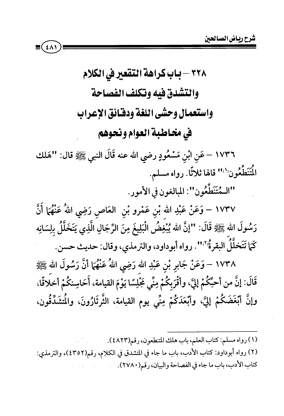 1736 - عن ابن مسعود رضي الله عنه أن النبي صلى الله عليه وسلم قال: هلك المتنطعون قالها ثلاثة رواه مسلم المتنطعون المبالغون في الأمور