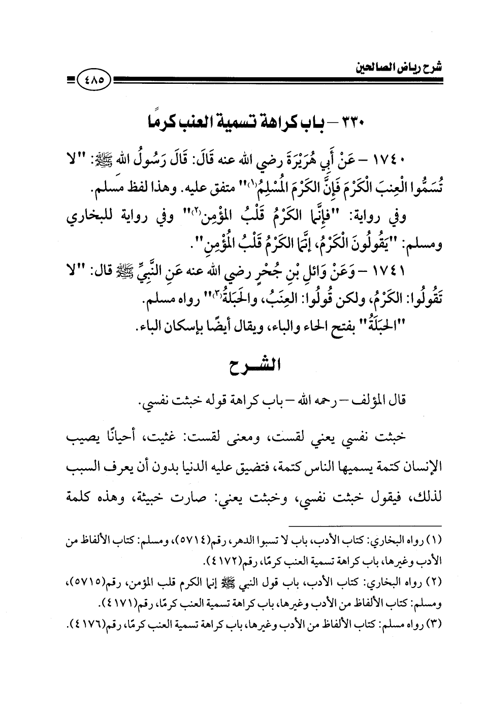 1740 - عن أبي هريرة رضي الله عنه قال: قال رسول الله صلى الله عليه وسلم لا تسموا العنب الكرم فإن الكرم المسلم متفق عليه وهذا لفظ مسلم وفي رواية فإنما الكرم قلب المؤمن وفي رواية للبخاري ومسلم يقولون الكرم إنما قلب المؤمن