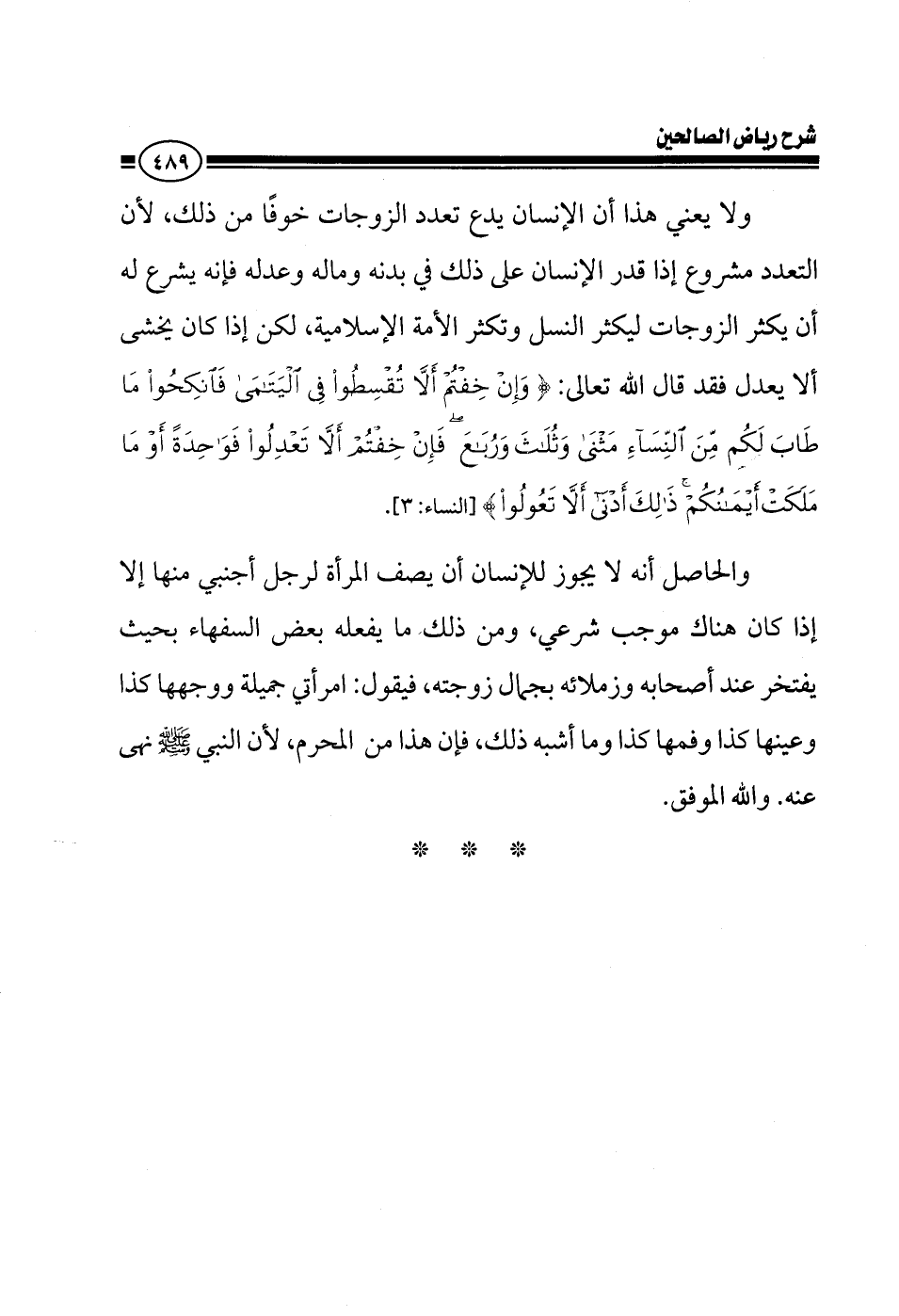 ولا يعني هذا أن الإنسان يدع التعدد تعدد الزوجات خوفا من ذلك لأن التعدد مشروع إذا قدر الإنسان على ذلك في بدنه وماله وعدله فإنه يشرع له أن يكثر الزوجات ليكثر النسل وتكثر الأمة الإسلامية لكن إذا كان يخشى ألا يعدل فقد قال الله تعالى فإن خفتم ألا تعدلوا فواحدة أو ما ملكت أيمانكم ذلك أدنى ألا تعدلوا والحاصل أنه لا يجوز للإنسان أن يصف المرأة لرجل أجنبي منها إلا إذا كان هناك موجب شرعي ومن ذلك ما يفعله بعض السفهاء بحيث يفتخر عند أصحابه وزملائه يقول امرأتي جميلة يعني يفتخر بجمال زوجته امرأتي جميلة ووجها كذا وعينها كذا وفمها كذا وما أشبه ذلك فإن هذا من المحرم لأن النبي صلى الله عليه وسلم نهى عنه والله الموفق