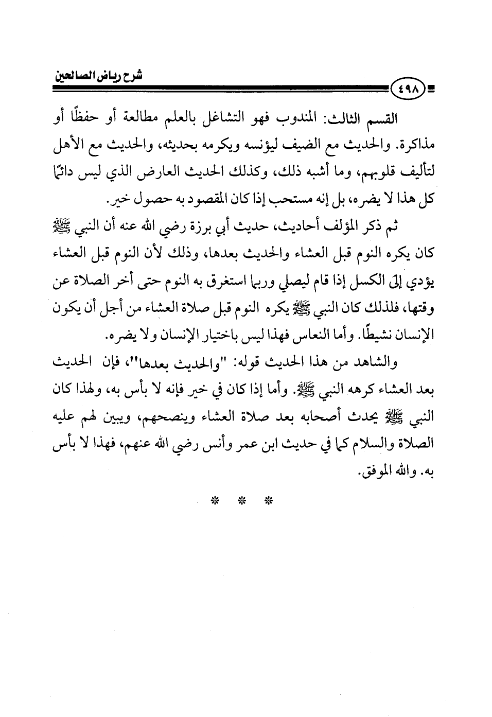 وأما المندوب فهو التشاغل بالعلم مطالعة أو حفظا أو مذاكرة والحديث مع الضيف ليؤنسه ويكرمه بحديثه والحديث مع الأهل لتأليف قلوبهم وما أشبه ذلك وكذلك الحديث العارض الذي ليس دائما كل هذا لا يضره بل أنه مستحب إذا كان المقصود به حصول خير ثم ذكر المؤلف أحاديث حديث أبي برزة رضي الله عنه أن النبي صلى الله عليه وسلم كان يكره النوم قبل العشاء والحديث بعدها وذلك لأن النوم قبل العشاء يؤدي إلى الكسل إذا قام ليصلي وربما استغرق به النوم حتى أخر الصلاة عن وقتها فلذلك كان النبي صلى الله عليه وسلم يكره النوم قبل صلاة العشاء من أجل أن يكون الإنسان نشيطا وأما النعاس فهذا ليس باختيار الإنسان ولا يضره والشاهد من هذا الحديث قوله والحديث بعدها فإن الحديث بعد العشاء كرهه النبي صلى الله عليه وسلم وأما إذا كان في خير فإنه لا بأس به ولهذا كان النبي صلى الله عليه وسلم يحدث أصحابه بعد صلاة العشاء وينصحهم ويبين لهم عليه الصلاة والسلام فهذا لا بأس به والله الموفق