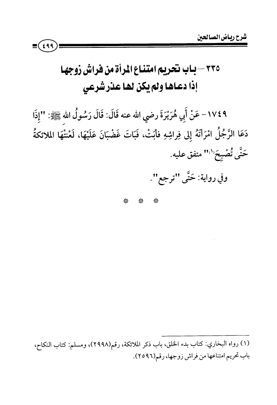 1749 - عن أبي هريرة رضي الله عنه قال: قال رسول الله صلى الله عليه وسلم إذا دعا الرجل امرأته إلى فراشه فأبت فبات غضبان عليها لعنتها الملائكة حتى تصبح متفق عليه وفي رواية حتى ترجع