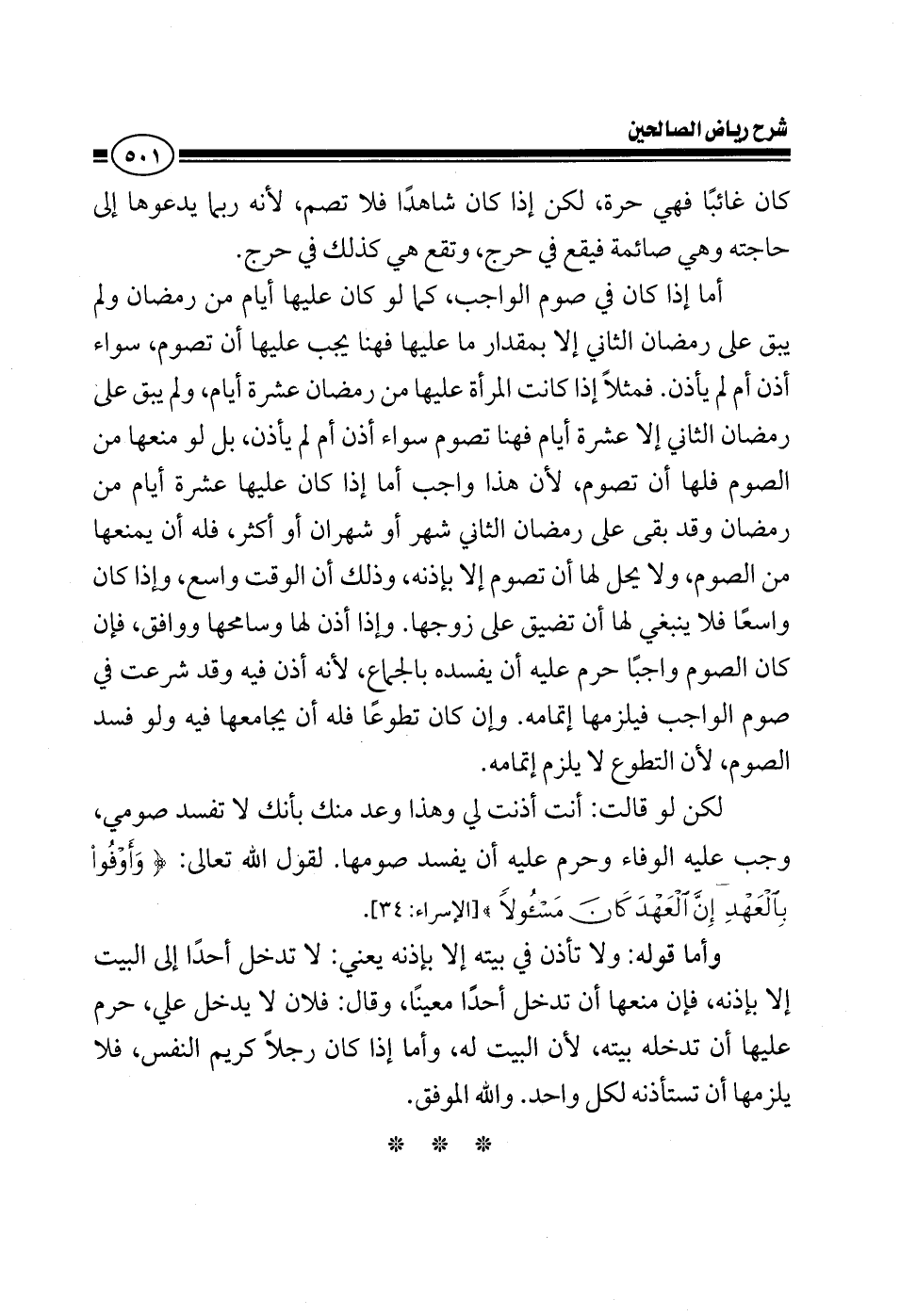 كان غائبا فهي حرة لكن إذا كان شاهدا فلا تصم لأنه ربما يدعوها إلى حاجته وهي صائمة فيقع في حرج وتقع هي كذلك في حرج أما إذا كان في صوم الواجب كما لو كان عليها أيام من رمضان ولم يبق على رمضان الثاني إلا بمقدار ما عليها فهنا يجب عليها أن تصوم سواء إذن أم لم يأذن فمثلا إذا كانت المرأة عليها من رمضان عشرة أيام ولم يبق على رمضان الثاني إلا عشرة أيام فهنا تصوم سواء أذن أم لم يأذن بل لو منعها من الصوم فلها أن تصوم لأن هذا واجب أما إذا كان عليها عشرة أيام من رمضان وقد بقى على رمضان الثاني شهر أو شهران أو أكثر فله أن يمنعها من الصوم ولا يحل لها أن تصوم إلا بإذنه وذلك أن الوقت واسع وإذا كان واسعا فلا ينبغي لها أن تضيق على زوجها وإذا أذن لها وسامحها ووافق فإن كان الصوم واجبا حرم عليه أن يفسده بالجماع لأنه أذن فيه وقد شرعت في صوم الواجب فليلزمها إتمامه وإن كان تطوعا فله أن يجامعها فيه ولو فسد الصوم لأن التطوع لا يلزم إتمامه لكن لو قالت أنت أذنت لي وهذا وعد منك بأنك لا تفسد صومي وجب عليه الوفاء وحرم عليه أن يفسد صومها لقول الله تعالى {وأوفوا بالعهد إن العهد كان مسؤولا} وأما قوله ولا تأذن في بيته إلا بإذنه يعني لا تدخل أحدا إلى البيت إلا بإذنه فإن منعها أن تدخل أحدا معينا قال فلان لا يدخل علي حرم عليها أن تدخله بيته لأن البيت له وأما إذا كان رجلا واسع الصدر لا يهمه أن يدخل إلى أهله أحد فلا يلزمها أن تستأذنه لكل واحد والله الموفق