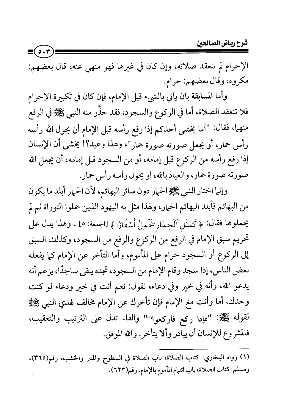 الإحرام لم تنعقد صلاته وإن كان في غيرها فهو منهي عنه قال بعضهم مكروه وقال بعضهم حرام وأما المسابقة بأن يأتي بالشيء قبل الإمام فسبق أنه في تكبيرة الإحرام لا تنعقد الصلاة أما في الركوع والسجود فقد حذر منه النبي صلى الله عليه وسلم في الرفع منهما فقال أما يخشى أحدكم إذا رفع رأسه قبل الإمام أن يحول الله رأسه رأس حمار أو يجعل صورته صورة حمار وهذا وعيد يخشى أن الإنسان إذا رفع رأسه من الركوع قبل إمامه أو من السجود قبل إمامه أن يجعل الله صورته صورة حمار والعياذ بالله أو يحول رأسه إلى رأس حمار وإنما اختار النبي صلى الله عليه وسلم الحمار دون سائر البهائم لأن الحمار أبلد ما يكون من البهائم أبلد البهائم الحمار ولهذا مثل به اليهود الذين حملوا التوراة ثم لم يحملوها فقال: كمثل الحمار يحمل أسفارا وهذا يدل على تحريم سبق الإمام في الرفع من الركوع والرفع من السجود وكذلك السبق إلى الركوع أو السجود حرام على المأموم وأما التأخر عن الإمام كما يفعله بعض الناس إذا سجد وقام الإمام من السجود تجده يبقى ساجدا يزعم أنه يدعو الله وأنه في خير ودعاء نقول نعم أنت في خير ودعاء لو كنت وحدك أما وأنت مع الإمام فإن تأخرك عن الإمام مخالف لهدي النبي صلى الله عليه وسلم لقوله صلى الله عليه وسلم فإذا ركع فاركعوا والفاء تدل على الترتيب والتعقيب فالمشروع للإنسان أن يبادر وألا يتأخر ويأتي الكلام عن الحديثين إن شاء الله تعالى