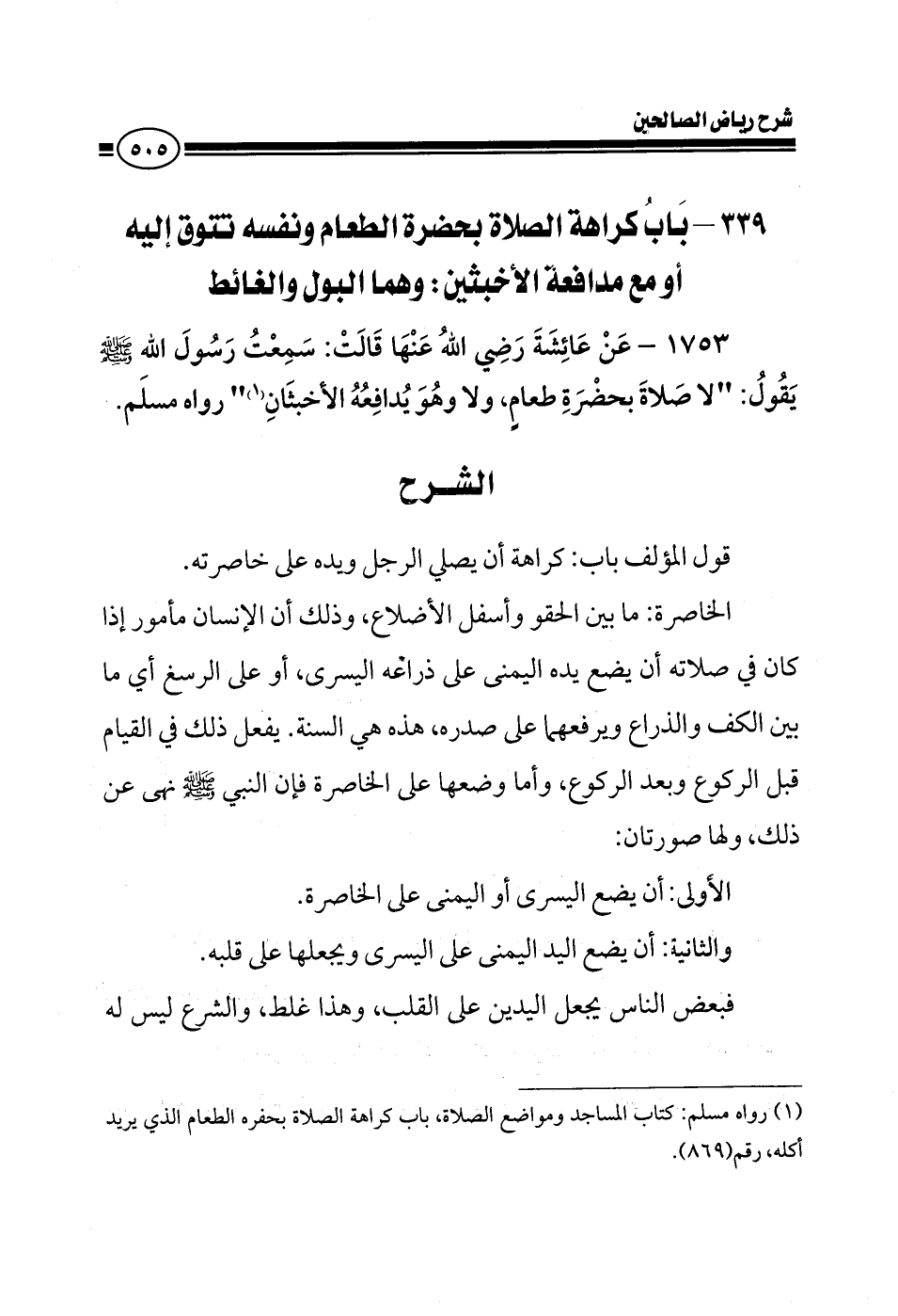 1753 - عن عائشة رضي الله عنها قالت: سمعت رسول الله صلى الله عليه وسلم يقول لا صلاة بحضرة طعام ولا وهو يدافعه الأخبثان رواه مسلم