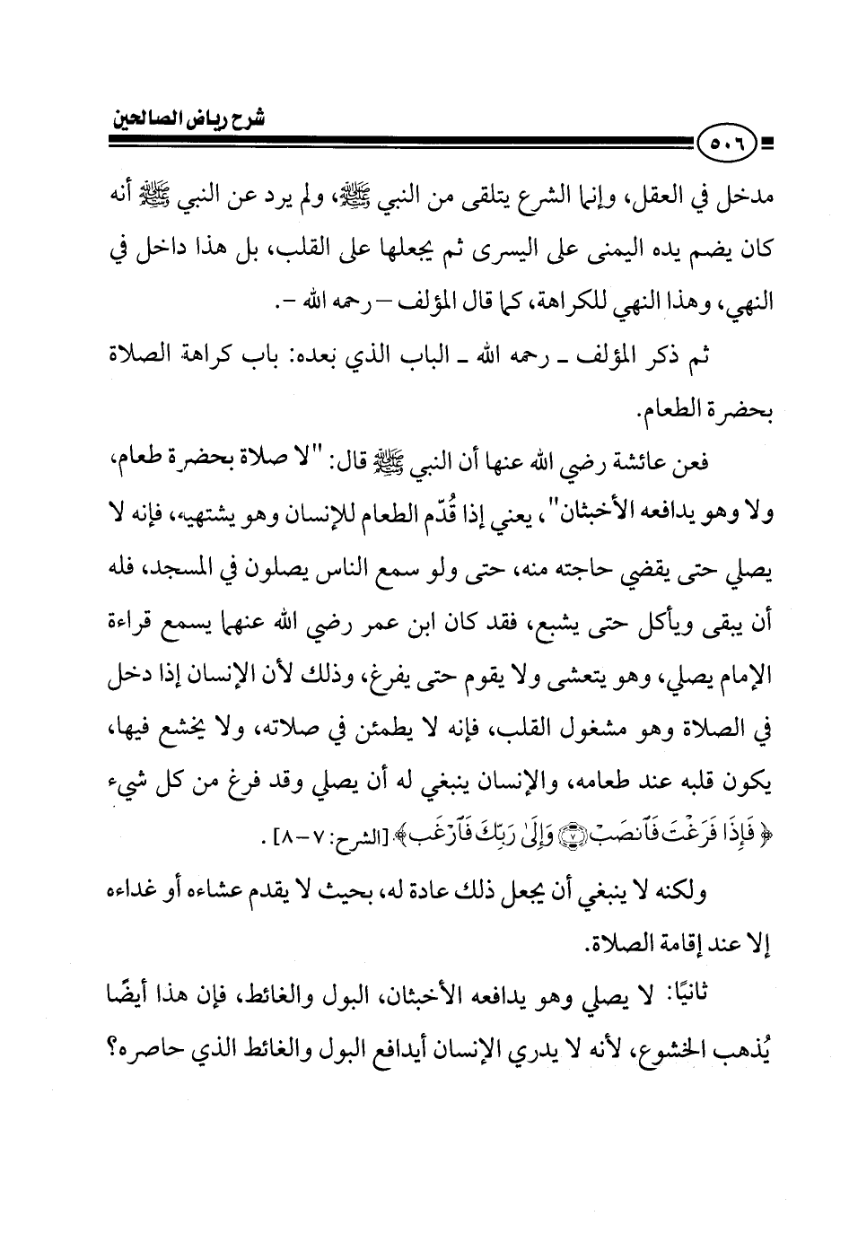مدخل في العقل الشرع يتلقى من النبي صلى الله عليه وسلم ولم يرد عن النبي صلى الله عليه وسلم أنه كان يضم يده اليمنى على اليسرى ثم يجعلها على الخاصرة بل هذا داخل في النهي وهذا النهي للكراهة كما قال المؤلف رحمه الله ثم ذكر المؤلف في الباب الثاني باب كراهة الصلاة بحضرة الطعام الذي يشتهيه أو حال مدافعة الأخبثين فعن عائشة رضي الله عنها أن النبي صلى الله عليه وسلم قال لا صلاة بحضرة طعام ولا وهو يدافعه الأخبثان يعني إذا قدم الطعام للإنسان وهو يشتهيه فإنه لا يصلي حتى يقضي حاجته منه حتى ولو سمع الناس يصلون في المسجد فله أن يبقى ويأكل حتى يشبع فقد كان ابن عمر رضي الله عنهما يسمع قراءة الإمام يصلي وهو يتعشى ولا يقوم حتى يفرغ وذلك لأن الإنسان إذا دخل في الصلاة وهو مشغول القلب فإنه لا يطمئن في صلاته ولا يخشع فيها يكون قلبه عند طعامه والإنسان ينبغي له أن يصلي وقد فرغ من كل شيء فإذا فرغت فانصب وإلى ربك فارغب ولكنه لا ينبغي أن يجعل ذلك عادة له بحيث لا يقدم عشاءه أو غداءه إلا عند إقامة الصلاة الثاني لا يصلي وهو يدافعه الأخبثان البول والغائط فإن هذا أيضا يذهب الخشوع لأنه لا يدري الإنسان أيدافع البول والغائط الذي حصره