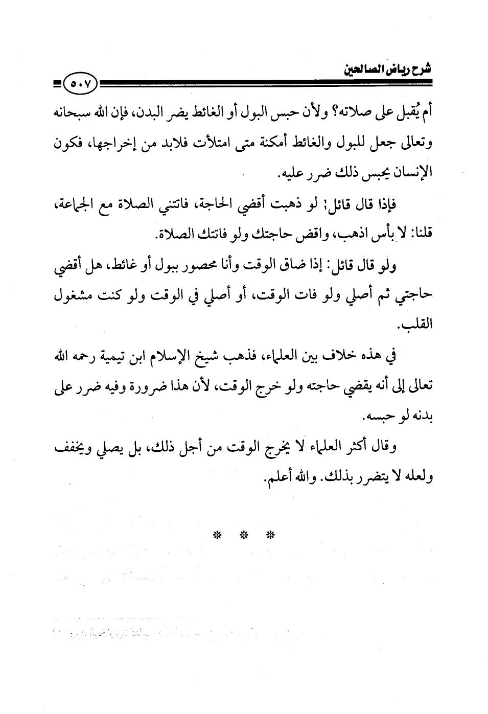 أم يقبل على صلاته ولأن حبس البول أو الغائط يضر البدن فإن الله سبحانه وتعالى جعل البول والغائط أمكنه متى امتلأت فلابد من إخراجها فكون الإنسان يحبس ذلك ضرر عليه فإذا قال قائل لو ذهبت أقضي الحاجة فاتتني الصلاة مع الجماعة قلنا لا بأس اذهب واقض حاجتك ولو فاتتك الصلاة ولو قال إذا ضاق الوقت وهو حصران في بول أو غائط هل يقضي حاجته ثم يصلي في ولو فات الوقت أو يصلي في الوقت ولو كان مشغول القلب ففي هذه خلاف بين العلماء ذهب شيخ الإسلام ابن تيمية رحمه الله تعالى إلى أنه يقضي حاجته ولو خرج الوقت لأن هذا ضرورة وفيه ضرر على بدنه لو حبسه وقال أكثر العلماء لا يخرج الوقت من أجل ذلك بل يصلي ويخفف ولعله لا يتضرر بذلك