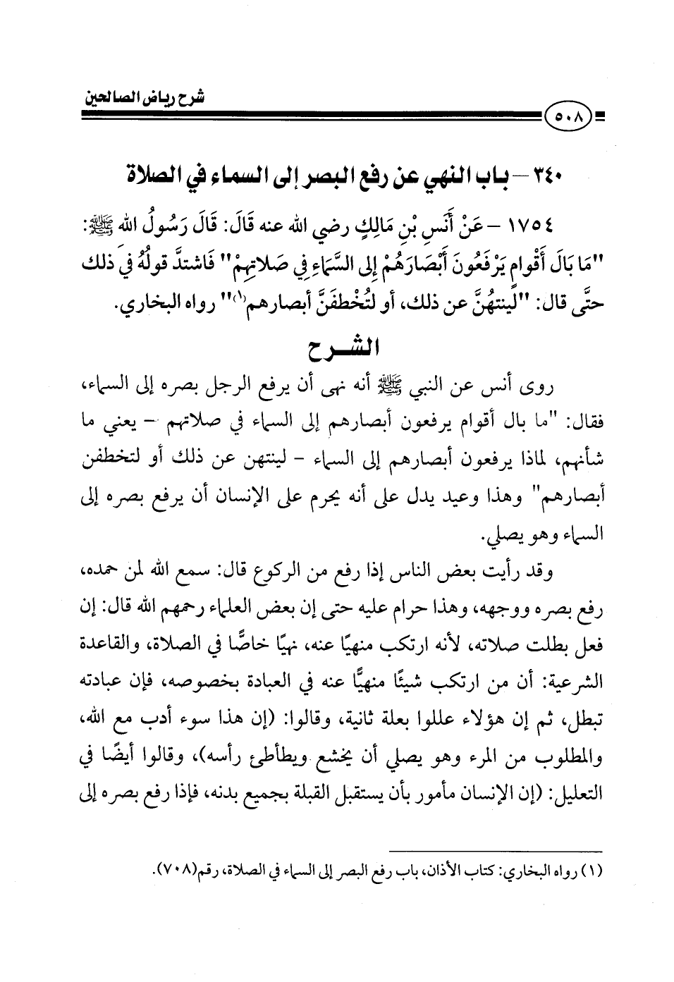 EXروى أنس عن النبي صلى الله عليه وسلم أنه نهى أن يرفع الرجل بصره إلى السماء فقال ما بال أقوام يرفعون أبصارهم إلى السماء في الصلاة يعني ما شأنهم لماذا يرفعون أبصارهم إلى السماء لينتهن عن ذلك أو لتخطفن أبصارهم وهذا وعيد يدل على أنه يحرم على الإنسان أن يرفع بصره إلى السماء وهو يصلي وقد رأيت بعض الناس إذا رفع من الركوع قال سمع الله لمن حمده رفع بصره ووجهه وهذا حرام عليه حتى إن بعض العلماء رحمهم الله قال إن فعل بطلت صلاته لأنه ارتكب منهيا عنه نهيا خاصا في الصلاة والقاعدة الشرعية أن من ارتكب شيئا منهيا عنه في العبادة بخصوصه فإن عبادته تبطل ثم إن هؤلاء عللوا بعلة ثانية وقالوا إن هذا سوء أدب مع الله والمطلوب من المرء وهو يصلي أن يخشع ويطأطأ رأسه وقالوا أيضا في التعليل إن الإنسان مأمور بأن يستقبل القبلة بجميع بدنه فإذا رفع بصره إلى
