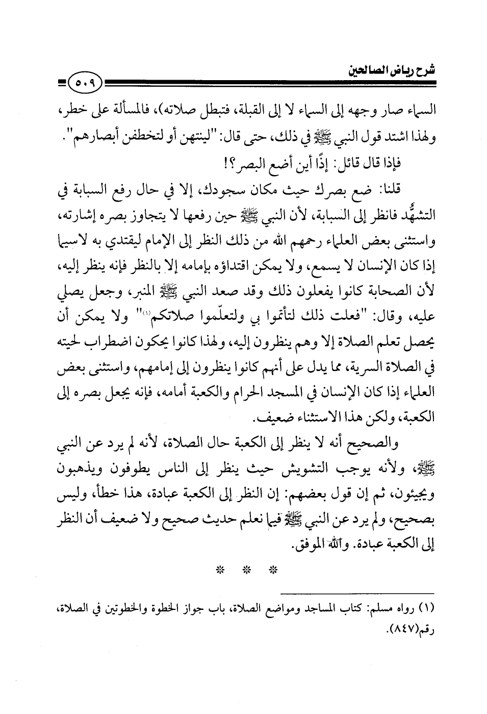 السماء صار وجهه إلى السماء لا إلى القبلة فتبطل صلاته فالمسألة على خطر ولهذا اشتد قول النبي صلى الله عليه وسلم في ذلك حتى قال لينتهن أو لتخطفن أبصارهم فإذا قال قائل إذا أين أضع بصري قلنا ضع بصرك حيث كان سجودك إلا في حال رفع السبابة في الدعاء في التشهد فانظر إلى السبابة لأن النبي صلى الله عليه وسلم حين رفعها لا يتجاوز بصره إشارته واستثنى بعض العلماء رحمهم الله من ذلك النظر إلى الإمام ليقتدي به لاسيما إذا كان الإنسان لا يسمع ولا يمكن إقتداؤه بإمامه إلا بالنظر فإنه ينظر إليه لأن الصحابة كانوا يفعلون ذلك وقد صعد النبي صلى الله عليه وسلم المنبر وجعل يصلي علليه وقال فعلت ذلك لتأتموا بي ولتعلموا صلاتكم ولا يمكن أن يحصل تعليم الصلاة إلا وهم ينظرون إليه ولهذا كانوا يحكون اضطراب لحيته في الصلاة السرية مما يدل على أنهم كانوا ينظرون إلى إمامهم واستثنى بعض العلماء إذا كان الإنسان في المسجد الحرام والكعبة أمامه فإنه يجعل بصره إلى الكعبة ولكن هذا الاستثناء ضعيف الصحيح أنه لا ينظر إلى الكعبة حال الصلاة لأنه لم يرد عن النبي صلى الله عليه وسلم ولأنه يوجب التشويش حيث ينظر إلى الناس يطوفون ويذهبون ويجيئون ثم إن قول بعضهم إن النظر إلى الكعبة عبادة خطأ ليس بصحيح لم يرد عن النبي صلى الله عليه وسلم فيما نعلم حديث صحيح ولا ضعيف أن النظر إلى الكعبة عبادة