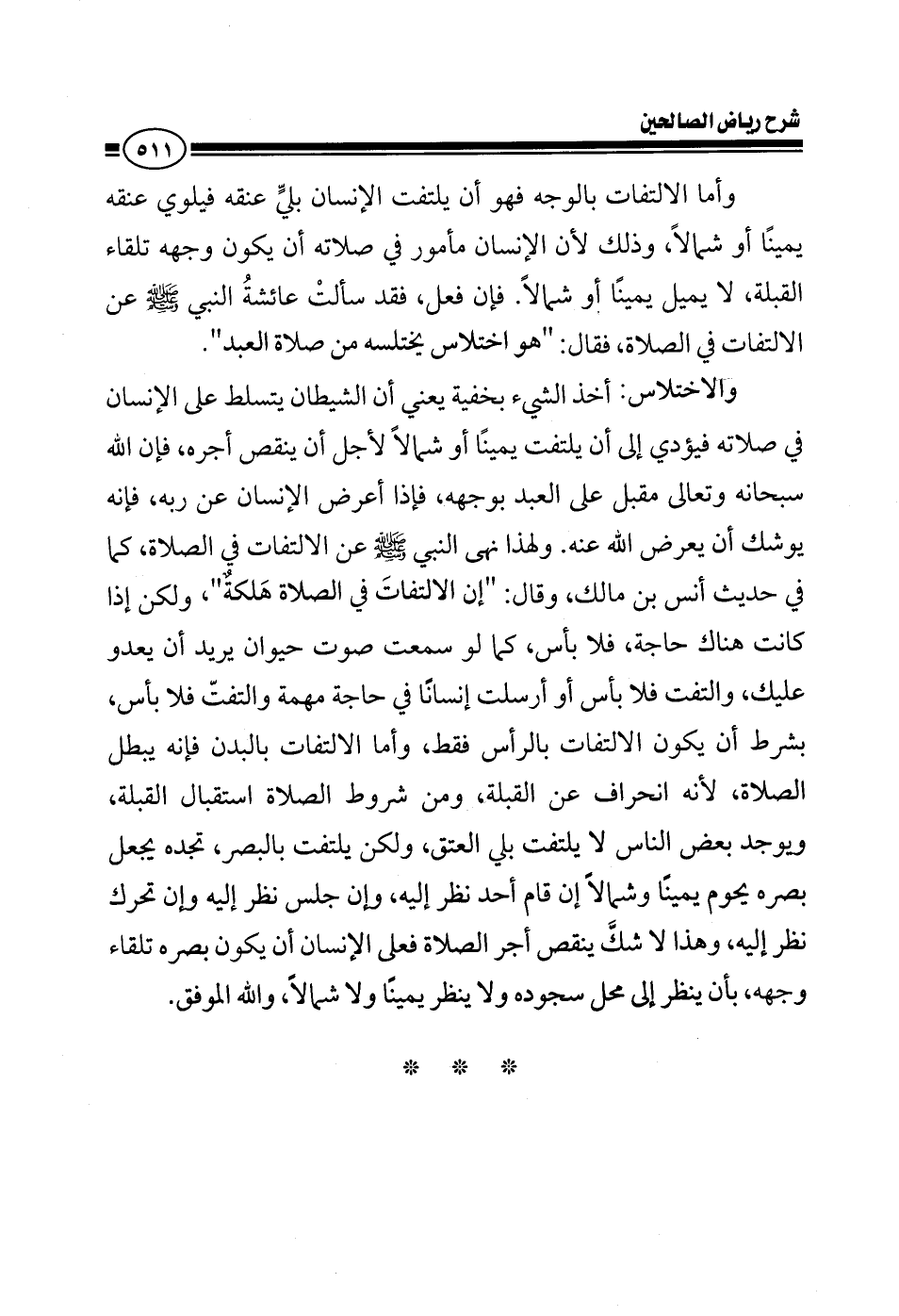 وأما الالتفات بالوجه فهو أن يلتفت الإنسان بلي عنقه يلوي عنقه يمينا أو شمالا وذلك لأن الإنسان مأمور في صلاته أن يكون وجهه تلقاء القبلة لا يميل يمينا ولا شمالا فإن فعل فقد سألت عائشة أن النبي صلى الله عليه وسلم نهى عن الالتفات في الصلاة فقال هو اختلاس يختلسه الشيطان من صلاة العبد والاختلاس أخذ الشيء بخفية يعني أن الشيطان يتسلط على الإنسان في صلاته فيؤدي إلى أن يتلفت يمينا أو شمالا لأجل أن ينقص أجره فإن الله سبحانه وتعالى مقبل على العبد بوجهه فإذا أعرض الإنسان عن ربه فإنه يوشك أن يعرض الله عنه ولهذا نهى النبي صلى الله عليه وسلم عن الالتفات في الصلاة كما في حديث أنس بن مالك وقال إن الالتفات في الصلاة هلكة ولكن إذا كان هناك حاجة فلا بأس كما لو سمعت صوت حيوان يريد أن يعدو عليك والتفت فلا بأس أو إنسانا في حاجة مهمة والتفت فلا بأس بشرط أن يكون الالتفات بالرأس فقط وأما الالتفات بالبدن فإنه يبطل الصلاة لأنه انحراف عن القبلة ومن شروط الصلاة استقبال القبلة يوجد بعض الناس لا يلتفت بلى العنق ولكن يلتفت بالبصر تجده يجعل بصره يحوم يمينا وشمالا إن قام أحد نظر إليه وإن تحرك نظر إليه وهذا لا شك ينقص أجر الصلاة فعلى الإنسان أن يكون بصره تلقاء وجهه أن ينظر إلى محل سجوده ولا ينظر يمينا ولا شمالا والله الموفق