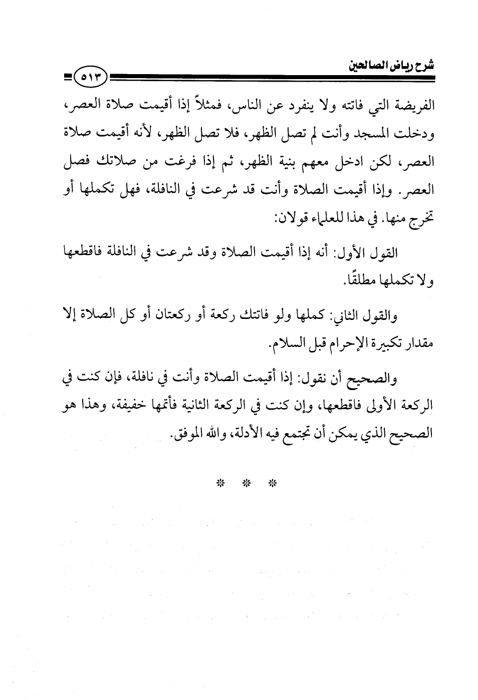 الفريضة التي فاتته ولا ينفرد عن الناس فمثلا إذا أقيمت صلاة العصر ودخلت المسجد وأنت لم تصل الظهر فلا تصلي الظهر لأنه أقيمت صلاة العصر لكن ادخل معهم بنية الظهر ثم إذا فرغت من صلاتك فصل العصر ولكن إذا أقيمت وأنت قد شرعت في النافلة فهل تكملها أو تخرج منها في هذا للعلماء قولان القول الأول أنه إذا أقيمت الصلاة وأنت قد شرعت في النافلة فاقطعها ولا تكملها مطلقا والقول الثاني كملها ولو فاتتك ركعة أو ركعتان أو كل الصلاة إلا مقدار تكبيرة الإحرام قبل السلام والصحيح أن نقول إذا أقيمت الصلاة وأنت في نافلة فإن كنت في الركعة الأولى فاقطعها وإن كنت في الركعة الثانية فأتمها خفيفة وهذا هو الصحيح الذي يمكن أن تجتمع فيه الأدلة