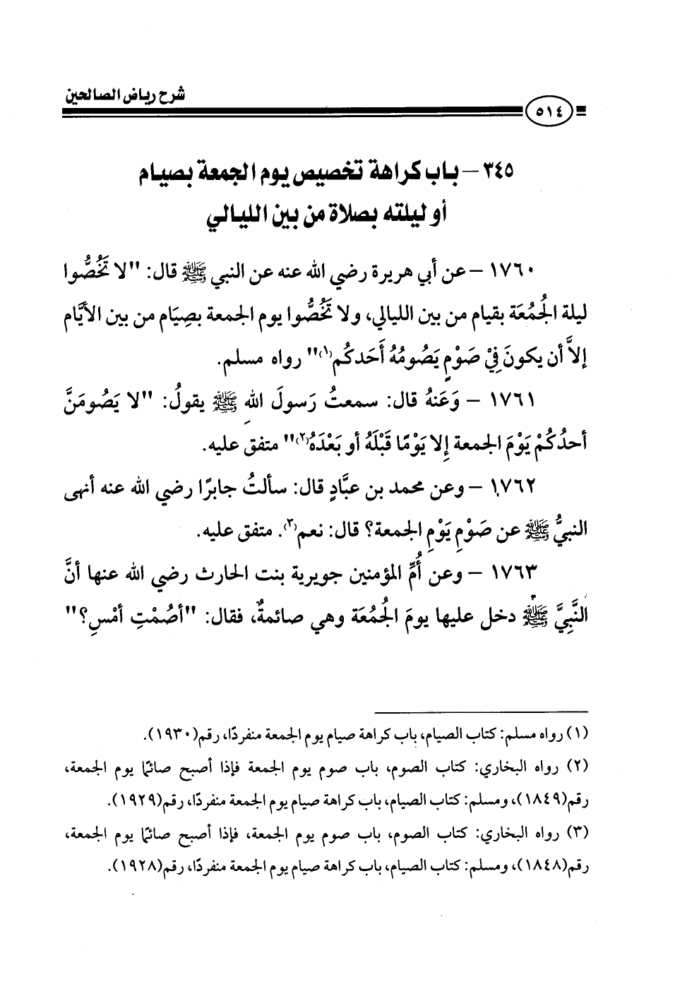 1760 - عن أبي هريرة رضي الله عنه عن النبي صلى الله عليه وسلم قال: لا تخصوا ليلة الجمعة بقيام من بين الليالي ولا تخصوا يوم الجمعة بصيام من بين الأيام إلا أن يكون في صوم يصومه أحدكم رواه مسلم
