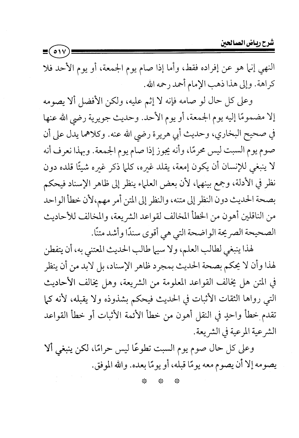النهي إنما هو عن إفراده فقط وأما إذا صيم يوم الجمعة أو يوم الأحد فلا كراهة وإلى هذا ذهب الإمام أحمد رحمه الله وعلى كل حال لو صامه فإنه لا إثم عليه ولكن الأفضل ألا يصومه إلا مضموما إليه يوم الجمعة أو يوم الأحد وحديث جويرية في صحيح البخاري وحديث محمد بن عباد في صحيح مسلم وكلاهما يدل على أن صوم يوم السبت ليس محرما وإنه يجوز إذا صام يوم الجمعة وهذا نعرف أنه ينبغي للإنسان ألا يكون إمعة يقلد غيره كلما ذكر غيره شيئا قلده دون نظر في الأدلة وجمع بينهما لأن بعض العلماء ينظر إلى ظاهر الإسناد فيحكم بصحة الحديث دون النظر إلى متنه والنظر إلى المتن أمر مهم لأن خطأ الواحد من الناقلين أهون من الخطأ المخالف لقواعد الشريعة والمخالف للأحاديث الصحيحة الصريحة الواضحة التي هي أقوى سندا وأشد متنا لهذا ينبغي لطالب العلم ولاسيما طالب الحديث المعتني به أن يتفطن له وألا يحكم بصحة الحديث بمجرد ظاهر الإسناد بل لابد من أن ينظر في المتن هل يخالف القواعد المعلومة من الشريعة هل يخالف الأحاديث التي رواها الثقات الأثبات في الحديث فليحكم بشذوذه ولا يقبله لأنه كما قلت لكم فخطأ واحد في النقل أهون من خطأ الأئمة الأثبات أو خطأ القواعد الشرعية المرعية في الشريعة على كل حال صوم يوم السبت تطوعا ليس حراما لكن ينبغي ألا يصومه إلا أن يصوم معه يوما قبله أو يوما بعده والله الموفق
