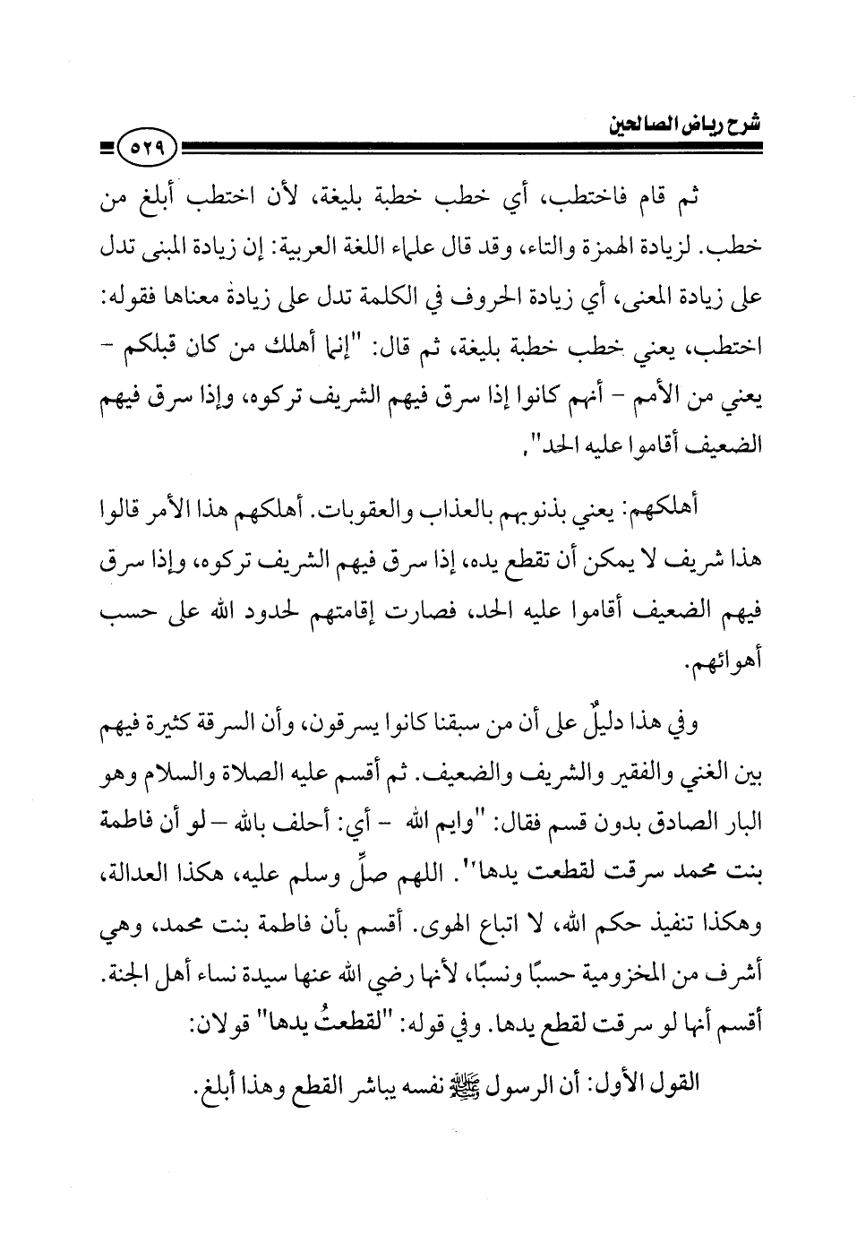 ثم قام فاختطب أي خطب خطبة بليغة لأن اختطب أبلغ من خطب لزيادة الهمزة والتاء وقد قال علماء اللغة العربية إن زيادة المبني تدل على زيادة المعنى يعني زيادة الحروف في الكلمة تدل على زيادة معناها المهم أن قوله اختطب يعني خطب خطبة بلغية ثم قال إنما أهلك من كان قبلكم يعني من الأمم أنهم كانوا إذا سرق فيهم الشريف تركوه وإذا سرق فيهم الضعيف أقاموا عليهم الحد أهلكهم يعني بذنوبهم بالعذاب والعقوبات إذا سرق فيهم الشريف تركوه وإذا سرق فيهم إذا سرق فيهم الضعيف أقاموا عليه الحد فصارت إقامتهم لحدود الله على حسب أهوائهم وفي هذا دليل على أن من سبقنا كانوا يسرقون وأن السرقة كبيرة فيهم بين الغني والفقير والشريف والضعيف ثم أقسم عليه الصلاة والسلام وهو البار الصادق بدون قسم أقسم قال وايم الله أي أحلف بالله لو أن فاطمة بنت محمد سرقت لقطعت يدها اللهم صلي وسلم عليه هكذا العدالة وهكذا تنفذ حكم الله لا اتباع الهوى أقسم بأن فاطمة بنت محمد وهي أشرف من المخزومية حسبا ونسبا لأنها رضي الله عنها سيدة نساء أهل الجنة أقسم أنها لو سرقت لقطع يدها وفي قوله لقطعت يدها قولان القول الأول أن الرسول صلى الله عليه وسلم نفسه يباشر القطع وهذا أبلغ