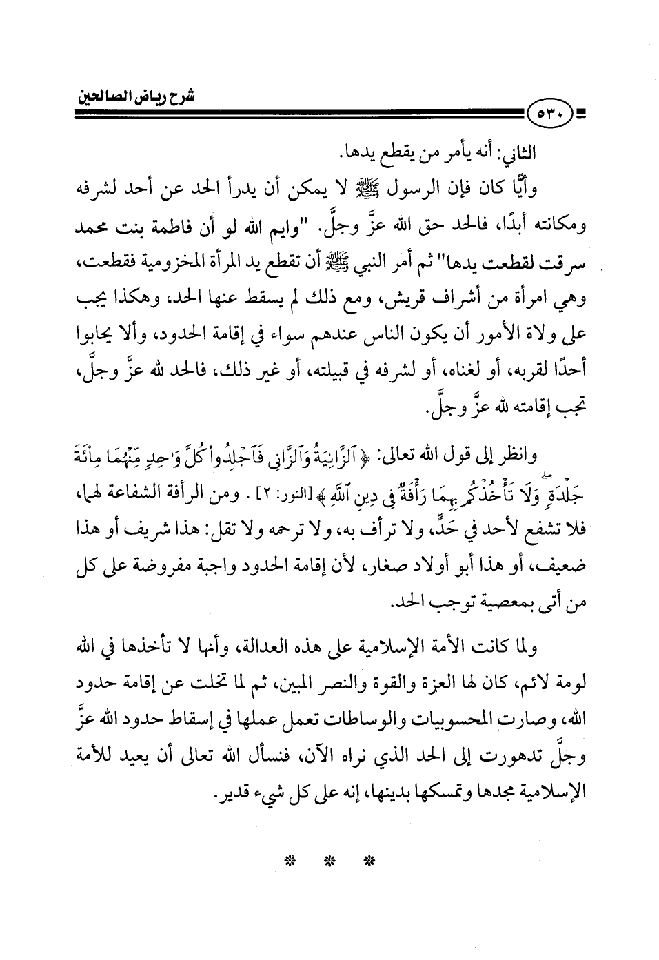 الثاني أنه يأمر من يقطع يدها وأيا كان فإن الرسول صلى الله عليه وسلم لا يمكن أن يدرأ الحد عن أحد لشرفه ومكانته أبدا الحد حق الله عز وجل وايم الله لو أن فاطمة بنت محمد سرقت لقطعت يدها ثم أمر النبي صلى الله عليه وسلم أن تقطع يد المرأة المخزومية فقطعت وهي امرأة من أشراف قريش ومع ذلك لم يسقط عنها الحد وهكذا يجب على ولاة الأمر أن يكون الناس عندهم سواء في إقامة الحدود وألا يحابوا أحدا لقربه أو لغناه أو لشرفه في قبيلته أو غير ذلك الحد لله عز وجل تجب إقامته لله عز وجل انظر إلى قوله تعالى {الزانية والزاني فاجلدوا كل واحد منهما مائة جلدة ولا تأخذكم بهما رأفة في دين الله} ومن الرأفة الشفاعة لهم لا تشفع لأحد في حد أقمه ولا ترفق به ولا ترحمه ولا تقل هذا شريف هذا ضعيف هذا أبو أولاد أبدا لا يهمك يعني لو زنى إنسان وهو محصن وثبت عليه الحد وله أولاد صغار وزوجات سوف يكن أرمل بعده والأولاد أيتاما بعده لا تبالي بهذا أقم الحد عليه ارجمه حتى يموت ولا تقل هذا له أولاد صغار وزوجات لا يهمك هذا أقم الحد على كل من أتى بمعصية توجب الحد ولما كانت الأمة الإسلامية على هذه العدالة وعدم المبالاة وأنها لا تأخذها في الله لومة لائم كان لها العزة والقوة والنصر المبين ولما تخلت الأمة الإسلامية عن إقامة حدود الله وصارت المحسوبيات والوساطات تعمل عملها في إسقاط حدود الله عز وجل تدهورت الأمة الإسلامية إلى الحد الذي ترونه الآن، فنسأل الله تعالى أن يعيد للأمة الإسلامية مجدها وتمسكها بدينها إنه على كل شيء قدير