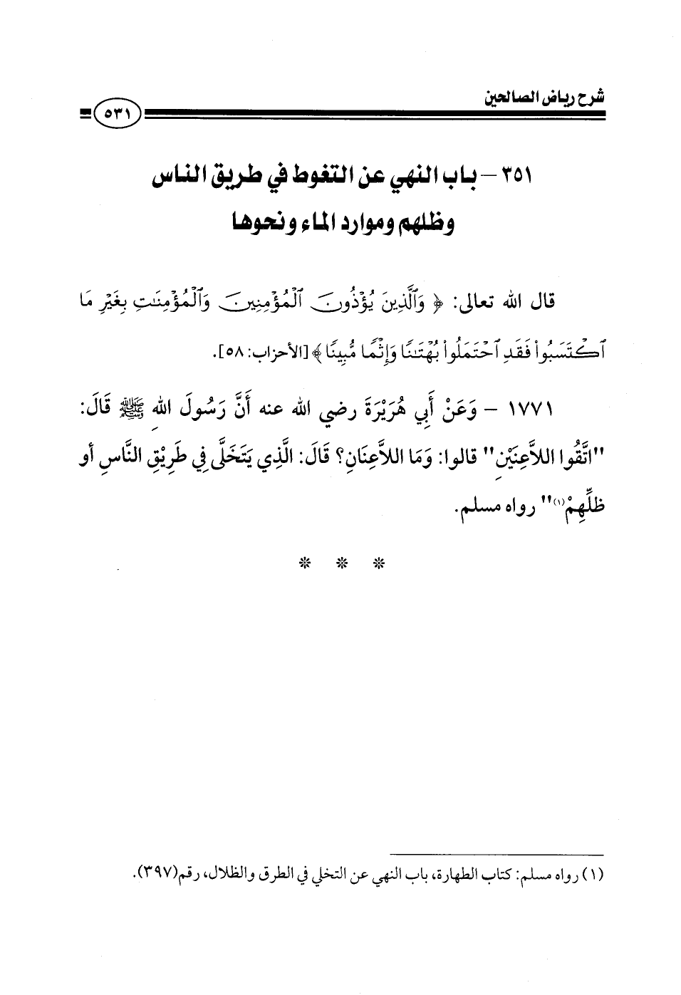 1771 - وعن أبي هريرة رضي الله عنه أن رسول الله صلى الله عليه وسلم قال: اتقوا اللاعنين قالوا وما اللاعنان قال الذي يتخلى في طريق الناس أو في ظلهم رواه مسلم