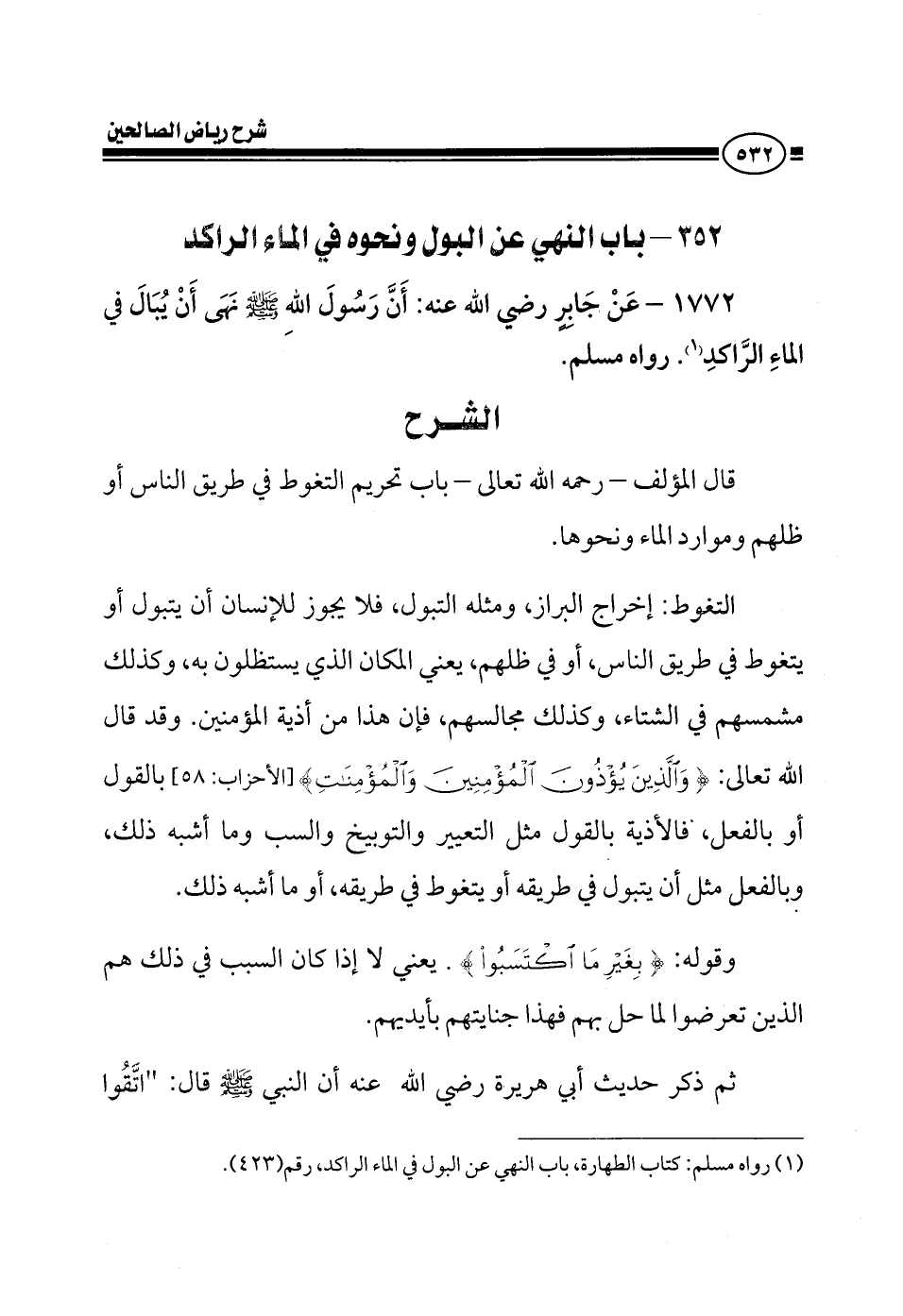 EXقال المؤلف رحمه الله في كتابه رياض الصالحين: باب تحريم التغوط في طريق الناس أو ظلهم أو نحو ذلك التغوط يعني إخراج البراز من الدبر ومثله التبول فلا يجوز للإنسان أن يتبول أو يتغوط في طريق الناس أو في ظلهم يعني المكان الذي يستظلون به وكذلك مشمسهم في الشتاء وكذلك مجالسهم فإن هذا من أذية المؤمنين وقد قال الله تعالى والذين يؤذون المؤمنين والمؤمنات بغير ما اكتسبوا فقد احتملوا بهتانا وإثما مبينا {والذين يؤذون المؤمنين والمؤمنات} بالقول أو بالفعل فالأذية بالقول مثل التعيير والتوبيخ والسب وما أشبه وبالفعل مثل أن يتبول في طريقه أو يتغوط أو ما أشبه ذلك وقوله {بغير ما اكتسبوا} يعني لا إذا كان السبب في ذلك هم الذين أذوا يعني أنهم تعرضوا لما حل بهم فهذا جنايتهم بأيديهم ثم ذكر حديث أبي هريرة رضي الله عنه أن النبي صلى الله عليه وسلم قال اتقوا