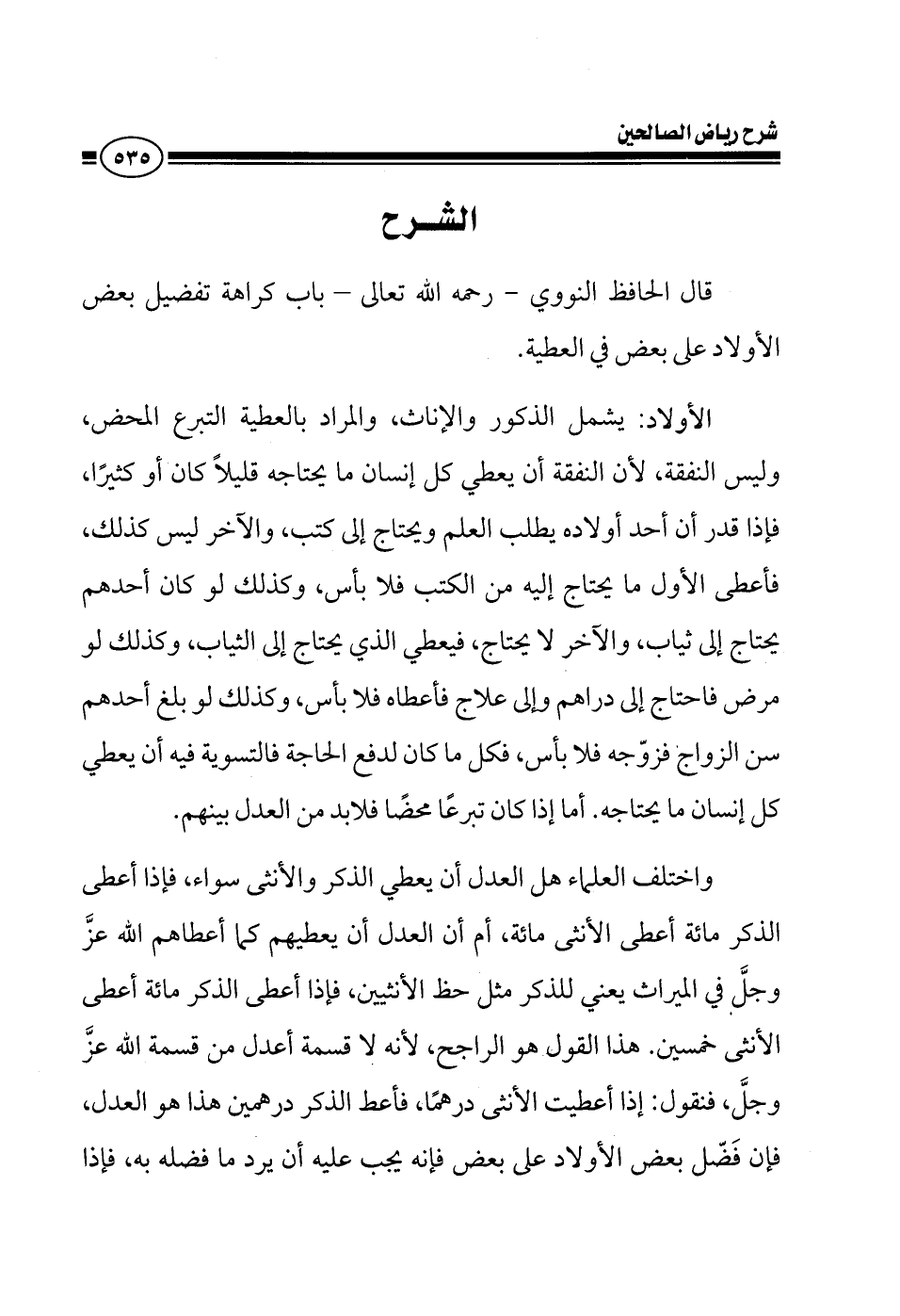 EXقال المؤلف رحمه الله تعالى في كتابه رياض الصالحين: باب تحريم تفضيل بعض الأولاد على بعض في العطية الأولاد يشمل الذكور والإناث والمراد بالعطية التبرع المحض ليس النفقة يعطي كل إنسان ما يحتاج قليلا كان أو كثيرا فإذا قدر أن أحدهم يطلب العلم ويحتاج إلى كتب والآخر ليس كذلك فأعطى الأول ما يحتاج إليه من الكتب فلا بأس وكذلك لو كان أحدهم يحتاج إلى ثياب والآخر لا يحتاج فيعطي من يحتاج إلى الثياب وكذلك لو مرض فاحتاج إلى دراهم وإلى دواء فأعطاه فلا بأس وكذلك لو بلغ أحدهم سن الزواج فزوجه فإنه يزوجه ولا بأس المهم ما كان لدفع الحاجة فالتسوية فيه أن يعطي كل إنسان ما يحتاجه أما إذا كان تبرعا محضا فلابد من التعديل بينهم واختلف العلماء هل التعديل أن يعطي الذكر والأنثى سواء فإذا أعطى الذكر مائة أعطى الأنثى مائة أم أن التعديل أن يعطيهم كما أعطاهم الله عز وجل في الميراث يعني للذكر مثل حظ الأنثيين فإذا أعطى الذكر مائة أعطى الأنثى خمسين وهذا القول هو الراجح لأنه لا قسمة أعدل من قسمة الله عز وجل فإذا أعطى كل واحد ما يحتاجه ثم تبرع تبرعا محضا فنقول إذا أعطيت الأنثى درهما فأعط الذكر درهمين هذا هو التعديل فإن فعل يعني فضل بعض الأولاد على بعض فإنه يجب عليه أن يرد ما فضله به فإذا