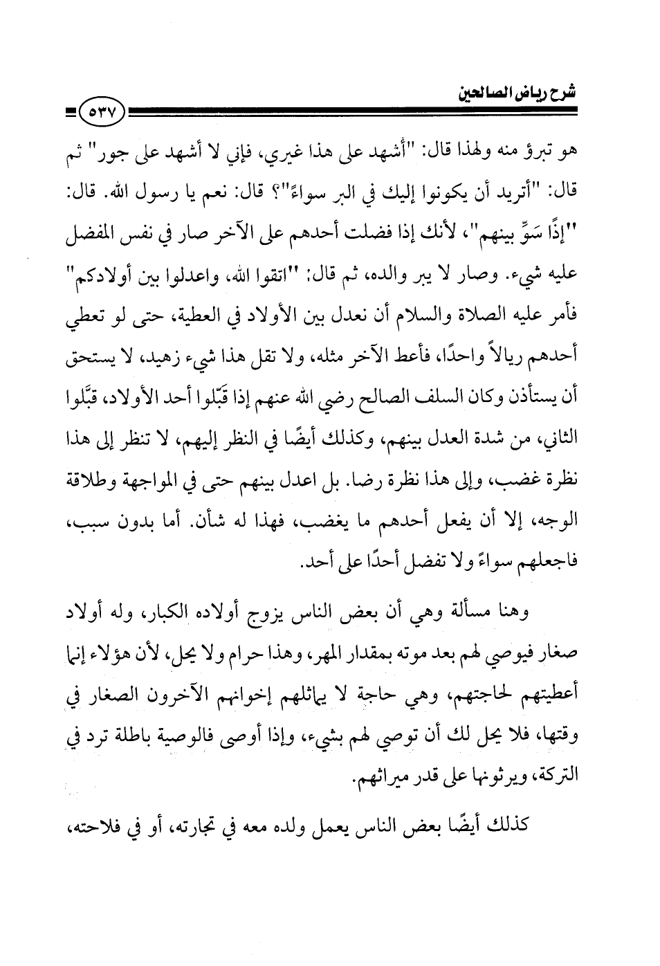 هو تبرؤ منه ولهذا قال أشهد على هذا غيري فإني لا أشهد على جور ثم قال أتريد أن يكونوا إليك في البر سواء قال نعم يا رسول الله قال إذا سوي بينهم لأنك إذا فضلت أحدهم على الآخر صار في نفس المفضل عليه شيء وصار لا يبر والده ثم قال اتقوا الله واعدلوا بين أولادكم فأمر عليه الصلاة والسلام أن نعدل بين الأولاد في العطية حتى لو تعطي أحدهم عشرة ريالات فأعط الآخر مثله لا تقل هذا شيء زهيد ما يساوي شيئا أبدا ولو ريال واحد ...