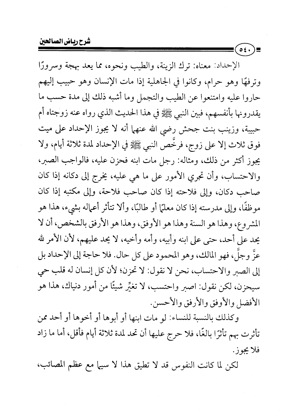 الإحداد معناه ترك الزينة والطيب ونحوه مما يعد بهجة وسرورا وترفها وهو حرام وكانوا في الجاهلية إذا مات الإنسان وهو حبيب إليهم امتنعوا عن الطيب والتجمل وما أشبه ذلك إلى مدة حسب ما يقدرونها بأنفسهم فبين النبي صلى الله عليه وسلم في هذا الحديث الذي رواه عنه زوجتاه أم حبيبة وزينب بنت جحش رضي الله عنهما أنه لا يجوز الإحداد على ميت فوق ثلاث إلا على زوج فرخص النبي صلى الله عليه وسلم في هذا في الإحداد لمدة ثلاثة أيام ولا يجوز أكثر من ذلك مثاله رجل مات ابنه فحزن عليه فالواجب الصبر والاحتساب وأن تجري الأمور على ما هي عليه يخرج إلى دكانه إذا كان صاحب دكان وإلى فلاحته إذا كان صاحب فلاحة وإلى مكتبه إذا كان موظفا وإلى مدرسته إذا كان معلما أو طالبا المهم ألا تتأثر أعماله بشيء هذا هو المشروع وهذا هو السنة وهذا هو الأوفق وهذا هو الأرفق بالشخص ألا يحد على أحد حتى على ابنه وأبيه وأمه وأخيه لا يحد عليهم الأمر لله عز وجل له الملك وله الحمد فهو المالك وهو المحمود على كل حال فلا حاجة إلى تحد اصبر واحتسب لا تقل لا تحزن كل إنسان له قلب حي سيحزن لكن نقول اصبر واحتسب وكأن شيئا لم يكن لا تخرب شيئا من أمور دنياك هذا هو الأفضل والأوفق والأرفق والأحسن لكن لما كانت النفوس قد لا تطيق هذا لاسيما مع عظم المصاب