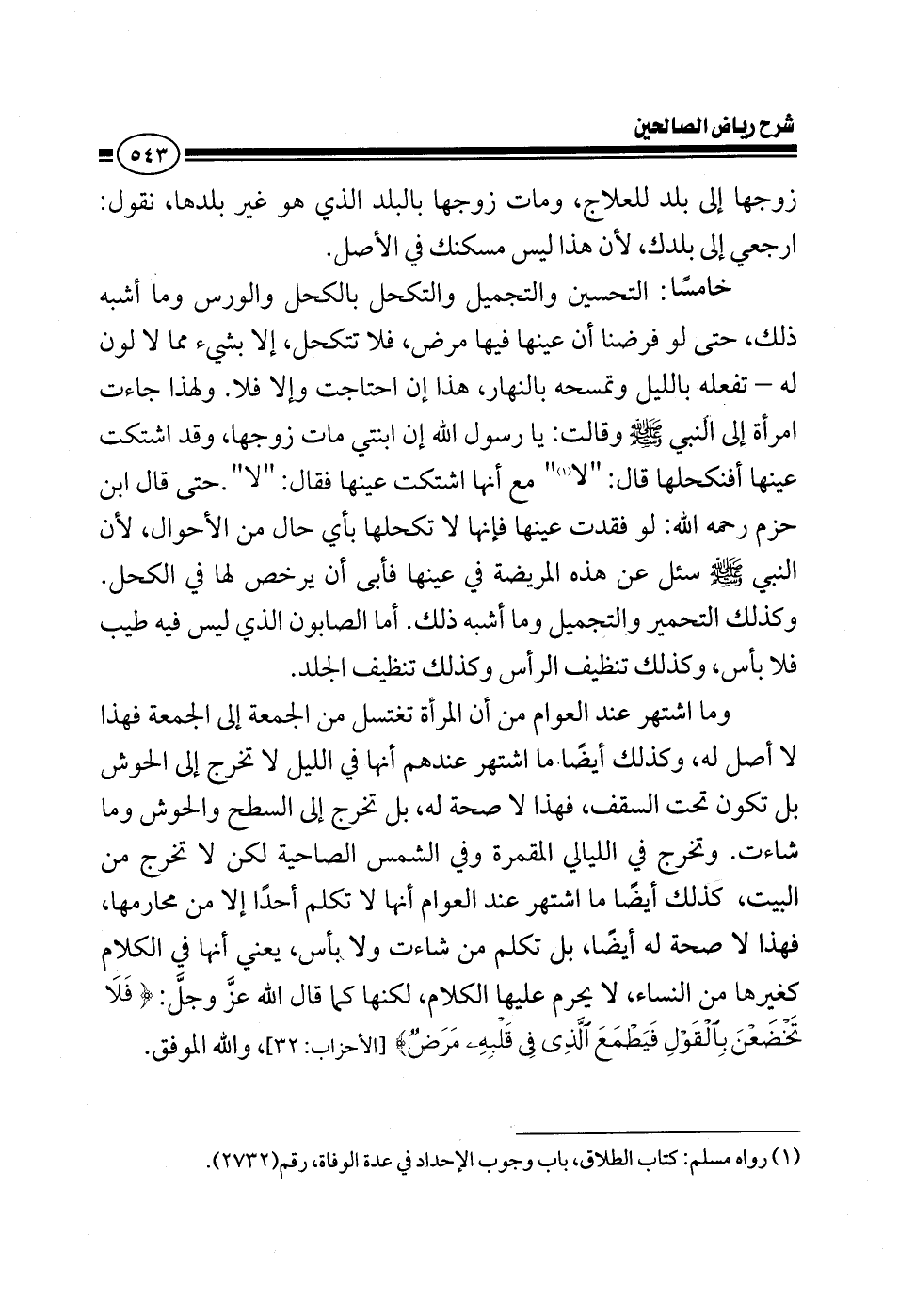 زوجها إلى بلد للعلاج ومات زوجها بالبلد الذي هو غير بلدها نقول ارجعي إلى بلدك لأن هذا ليس مسكنك في الأصل الخامس التجميل والتكحل بالكحل وما أشبه ذلك حتى لو فرضنا أن عينها فيها مرض فلا تتكحل إلا بصبر أو شبهه مما لا لون له تفعله بالليل وتمسحه بالنهار هذا إن احتاجت وإلا فلا ولهذا جاءت امرأة إلى النبي وقالت يا رسول الله إن ابنتي مات زوجها وقد اشتكت عينها يعني توجعها أفنكحلها قال لا مع أنها توجعها عينها فقال لا حتى قال ابن حزم رحمه الله لو فقدت عينها فإنها لا تكحلها بأي حال من الأحوال لأن النبي سئل عن هذه المريضة في عينها فأبى أن يرخص لهم في الكحل وكذلك التحمير والتجميل وما أشبه ذلك أما الصابون الذي ليس فيه طيب فلا بأس وكذلك تنظيف الرأس وكذلك تنظيف الجلد وما اشتهر عند العوام أن المرأة تغتسل من الجمعة إلى الجمعة يعني حمادة المحادة فهذا لا أصل له كذلك أيضا ما اشتهر عندهم أنها في الليل لا تخرج إلى الحوش بل تكون تحت السقف فهذا لا صحة له تخرج إلى ما شاءت كذلك ما اشتهر في العامية المحضة يقولون إن القمر رجل له عيون وأنف وفم فلا تخرج المرأة للقمر لأن القمر رجل يطلع عليها هذا غلط ما بصحيح تخرج في الليالي المقمرة وفي كل شيء لكن لا تخرج من البيت كذلك أيضا ما اشتهر عند العوام أنها لا تكلم أحد إلا من محارمها وهذا غلط أيضا تكلم من شاءت تكلم من يستأذن عند الباب وإلى من يتكلم في التليفون تكلمهم لا بأس تكلم من يدخل البيت من أقارب الزوج وأقاربها الذين ليسوا من محارمها تكلمهم ولا حرج ولا حرج يعني هي في الكلام كغيرها من النساء لا يحرم عليها الكلام لكنها كما قال الله عز وجل {فَلاَ تَخْضَعْنَ بِالْقَوْلِ فَيَطْمَعَ الَّذِي فِي قَلْبِهِ مَرَضٌ} والله الموفق