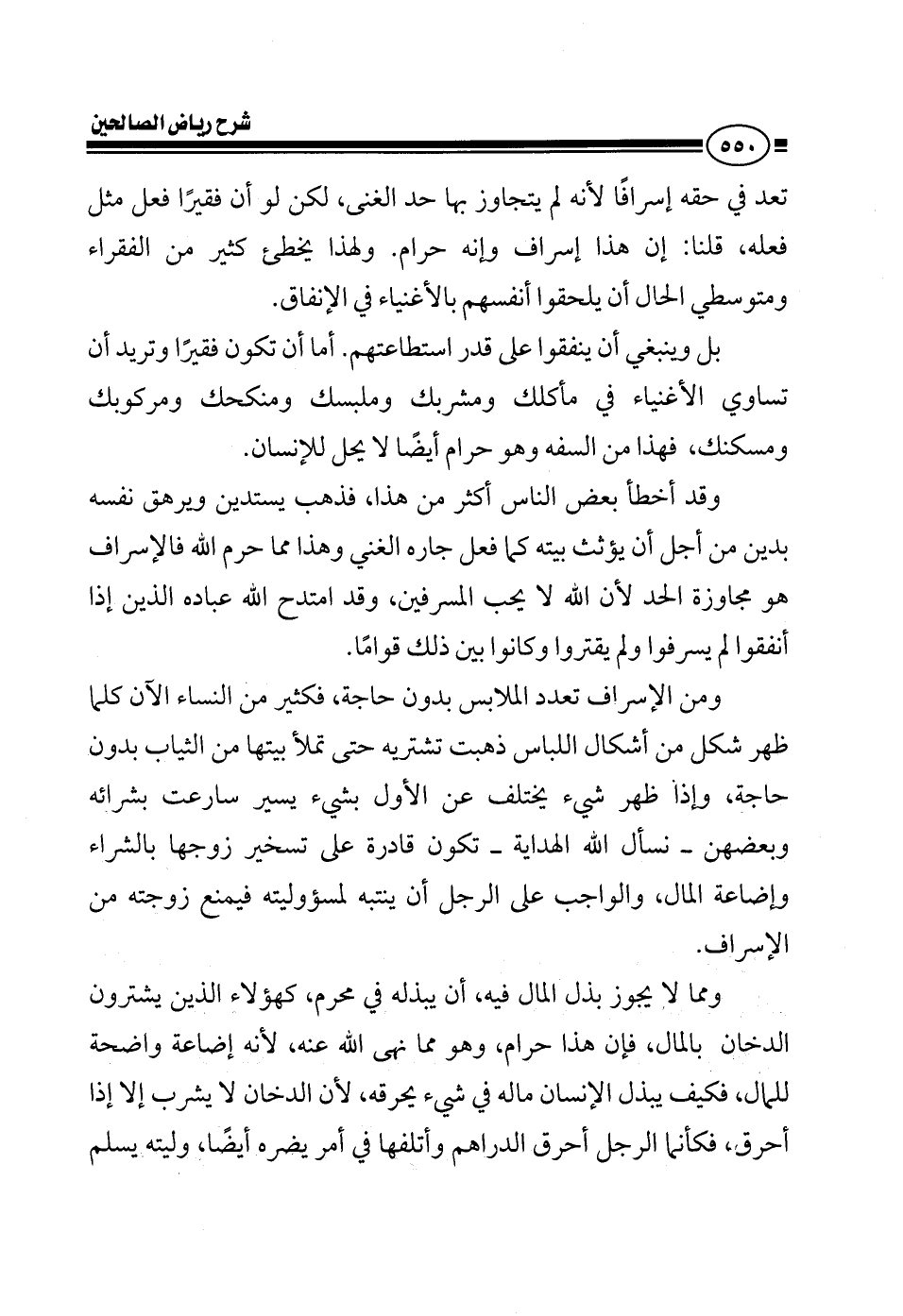 تعد من حقه إسرافا لأنه لم يتجاوز بها حد الغنى لكن لو أن فقيرا فعل مثل فعله قلنا إن هذا إسراف وإنه حرام ولهذا يغلط كثير من الناس الآن من الفقراء ومتوسطي الحال أن يلحقوا أنفسهم بالأغنياء هذا غلط وخطأ والإنسان كما قال العوام يمد رجله على قدر لحافه إذا كان اللحاف واسعا مد رجليك كلها وإذا كان ضيقا فكف رجليك أما أن تكون فقيرا وتريد أن تساوي الأغنياء في مأكلك ومشربك وملبسك ومنكحك ومركوبك ومسكنك فهذا من السفه وهو حرام أيضا لا يحل للإنسان وقد غلط بعض الناس أكثر من هذا فذهب يستدين ويرهق نفسه بدين من أجل أن يؤسس بيته كما أسس جاره الغني بيته وهذا غلط أيضا هذا مما حرم الله الإسراف هو مجاوزة الحد لأن الله لا يحب المسرفين وقد امتدح الله عباده الذين إذا أنفقوا لم يسرفوا ولم يقتروا وكانوا بين ذلك قواما ومن الإسراف تعدد الملابس بدون حاجة كثير من النساء الآن كلما ظهر شكل من أشكال اللباس ذهبت تشتريه حتى تملأ بيتها من الثياب بدون حاجة لكن ظهر شيء يختلف عن الأول بشيء بسيط تقول خلاص لا ألبسه وألبس الثوب الجديد ثم بعض النساء يلعب بعقول بعض الرجال فتجد المرأة هي التي توجه الرجل وتقول اشتري كذا اشتري كذا فصارت القوامة الآن للنساء على الرجال إلا من شاء الله والرجل يجب أن يكون رجلا يمنع زوجته من الإسراف سواء من مالها أو من ماله ومما لا يجوز بذل المال فيه أن يبذله في محرم كهؤلاء الذين يشترون الدخان ...
