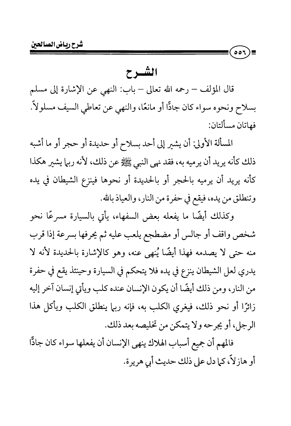 هاتان مسألتان: المسألة الأولى: أن يشير إلى أحد بسلاح أو حديدة أو حجر أو ما أشبه ذلك كأنه يريد أن يرميه به، فقد نهى النبي صلى الله عليه وسلم عن ذلك، لأنه ربما يشيرها هكذا كأنه يريد أن يرميه بالحجر أو بالحديدة أو نحوها فينزع الشيطان في يده وتنطلق من يده، فيقع في حفرة من النار، والعياذ بالله.