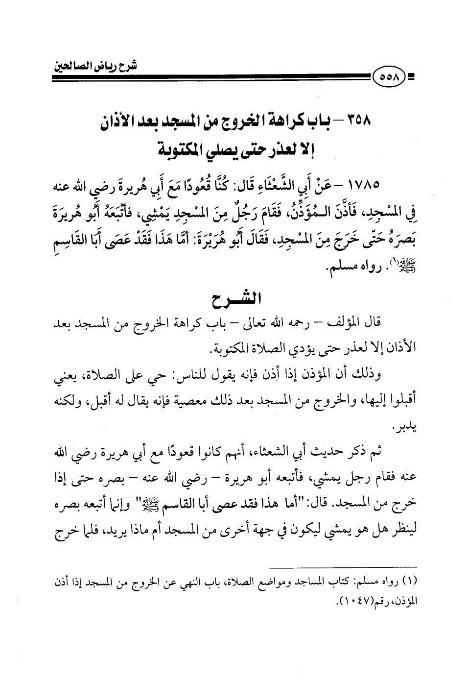 EXقال المؤلف رحمه الله تعالى باب كراهة الخروج من المسجد بعد الأذان حتى يؤدي الصلاة المكتوبة وذلك أن المؤذن إذا أذن فإنه يقول للناس حي على الصلاة يعني اقبلوا إليها والخروج من المسجد بعد ذلك معصية فإنه يقال أقبل ولكنه يدبر ثم ذكر حديث أبي الشعثاء أنهم كانوا قعودا مع أبي هريرة رضي الله عنه فقام رجل يمشي فأتبعه أبو هريرة بصره حتى إذا خرج من المسجد قال أما هذا فقد عصى أبا القاسم صلى الله عليه وسلم وإنما أتبعه بصره لينظر هل هو يمشي ليكون في جهة أخرى من المسجد أم ماذا يريد فلما خرج