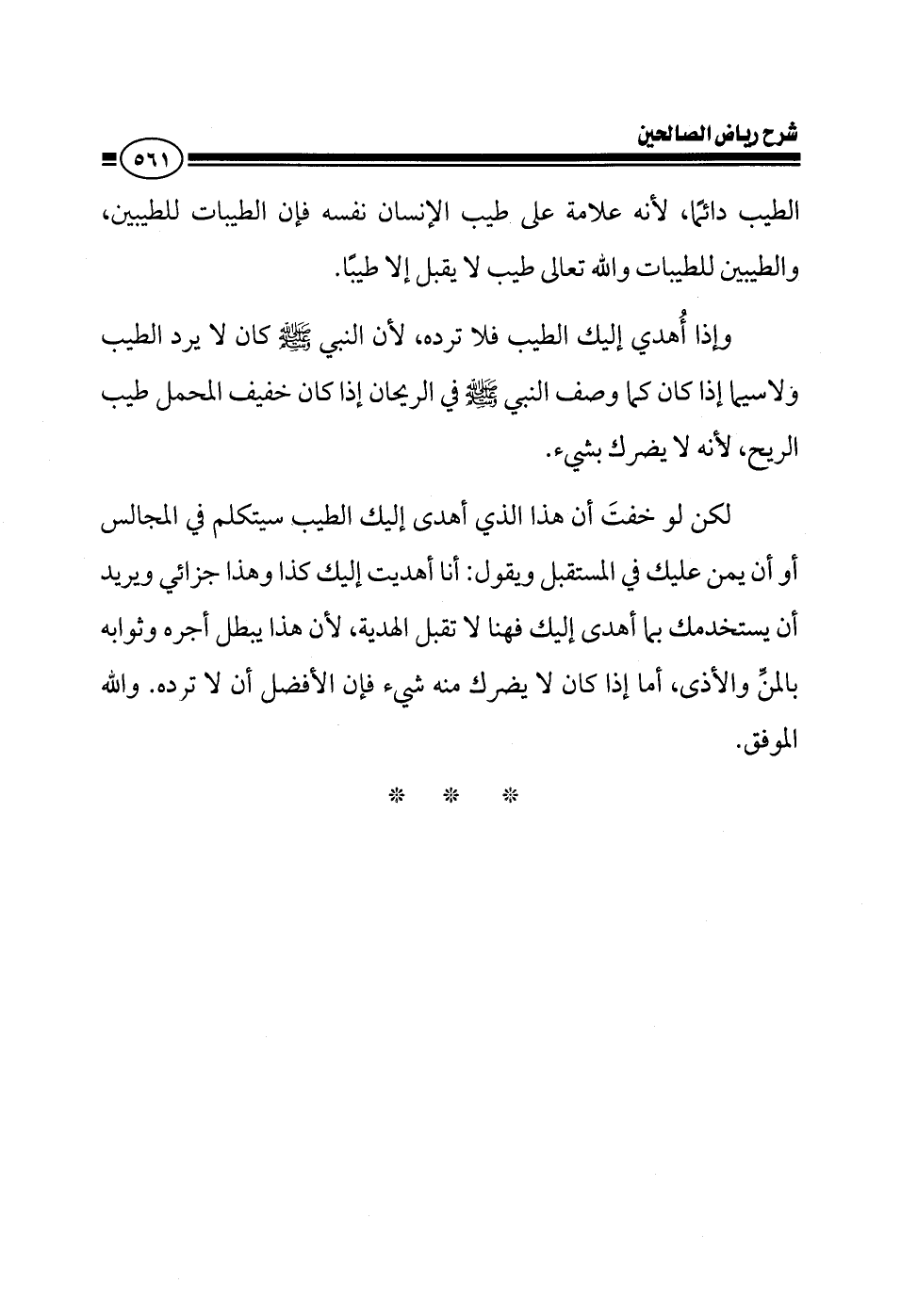 الطيب دائما لأنه علامة على طيب العبد فإن الطيبات للطيبين والطيبون للطيبات والله تعالى طيب لا يقبل إلا طيبا وإذا أهدى إليك الطيب فلا ترده لأن النبي صلى الله عليه وسلم كان لا يرد الطيب ولاسيما إذا كان كما وصف النبي صلى الله عليه وسلم في الريحان إذا كان خفيف المحمل طيب الريح لأنه لا يضرك شيء لكن لو خفت أن هذا الذي أهدي إليك الطيب سيتكلم في المجالس أو أن يمن عليك في المستقبل ويقول أنا أهديت إليك كذا وهذا جزائي ويريد منك أن يستخدمك بما أهدي إليك فهنا لا تقبل الهدية لأن هذا يبطل أجره وثوابه بالمن والأذى أما إذا كان لا يضرك منه شيء فإن الأفضل أن لا ترده والله الموفق
