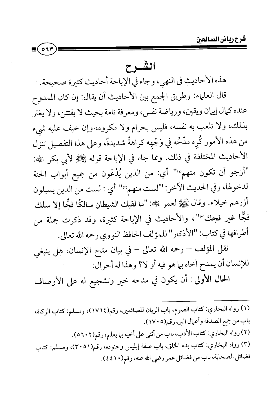 EXنقل المؤلف رحمه الله في كتابه رياض الصالحين في بيان مدح الإنسان هل ينبغي للإنسان أن يمدح أخاه بما هو فيه أو لا وهذا له أحوال الحال الأولى أن يكون في مدحه خير وتشجيع له على الأوصاف
