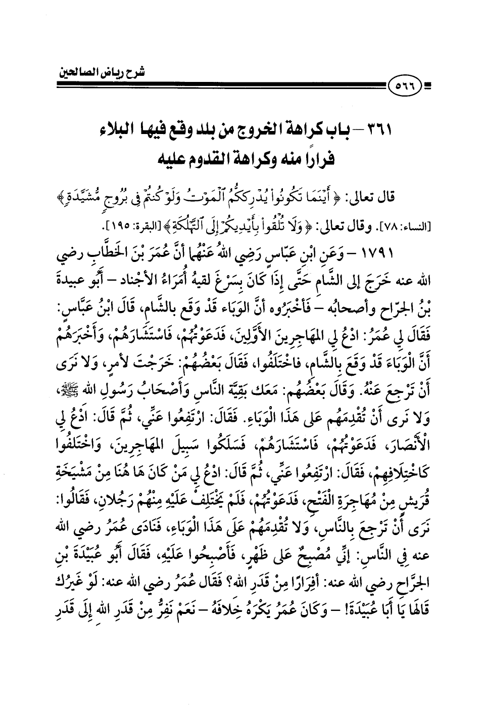 1791 - وعن ابن عباس رضي الله عنهما أن عمر بن الخطاب رضي الله عنه خرج إلى الشام حتى إذا كان بسرغ لقيه أمراء الأجناد أبو عبيدة بن الجراح وأصحابه فأخبروه أن الوباء قد وقع بالشام قال ابن عباس فقال لي عمر ادع لي المهاجرين الأولين فدعوتهم فاستشارهم وأخبرهم أن الوباء قد وقع بالشام فاختلفوا فقال بعضهم خرجت لأمر ولا نرى أن ترجع عنه وقال بعضهم معك بقية الناس وأصحاب رسول الله صلى الله عليه وسلم ولا نرى أن تقدمهم على هذا الوباء فقال ارتفعوا عني ثم قال ادع لي الأنصار فدعوتهم فاستشارهم فسلكوا سبيل المهاجرين واختلفوا كاختلافهم فقال ارتفعوا عني ثم قال ادع لي من كان هاهنا من مشيخة قريش من مهاجرة الفتح فدعوتهم فلم يختلف عليه منهم رجلان فقالوا نرى أن ترجع بالناس ولا تقدمهم على هذا الوباء فنادى عمر رضي الله عنه في الناس إني مصبح على ظهر فأصبحوا عليه فقال أبو عبيدة بن الجراح رضي الله عنه أفرارا من قدر الله فقال عمر رضي الله عنه لو غيرك قالها يا أبا عبيدة وكان عمر يكره خلافه نعم نفر من قدر الله إلى قدر