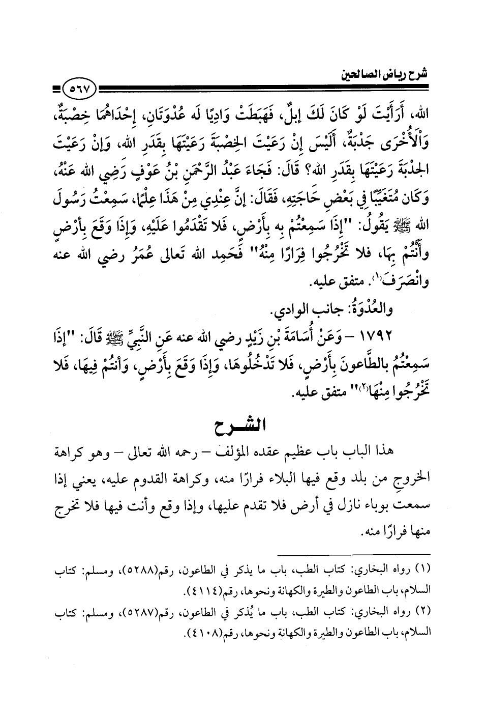 1792 - وعن أسامة بن زيد رضي الله عنه عن النبي صلى الله عليه وسلم قال إذا سمعتم الطاعون بأرض فلا تدخلوها وإذا وقع بأرض وأنتم فيها فلا تخرجوا منها متفق عليه