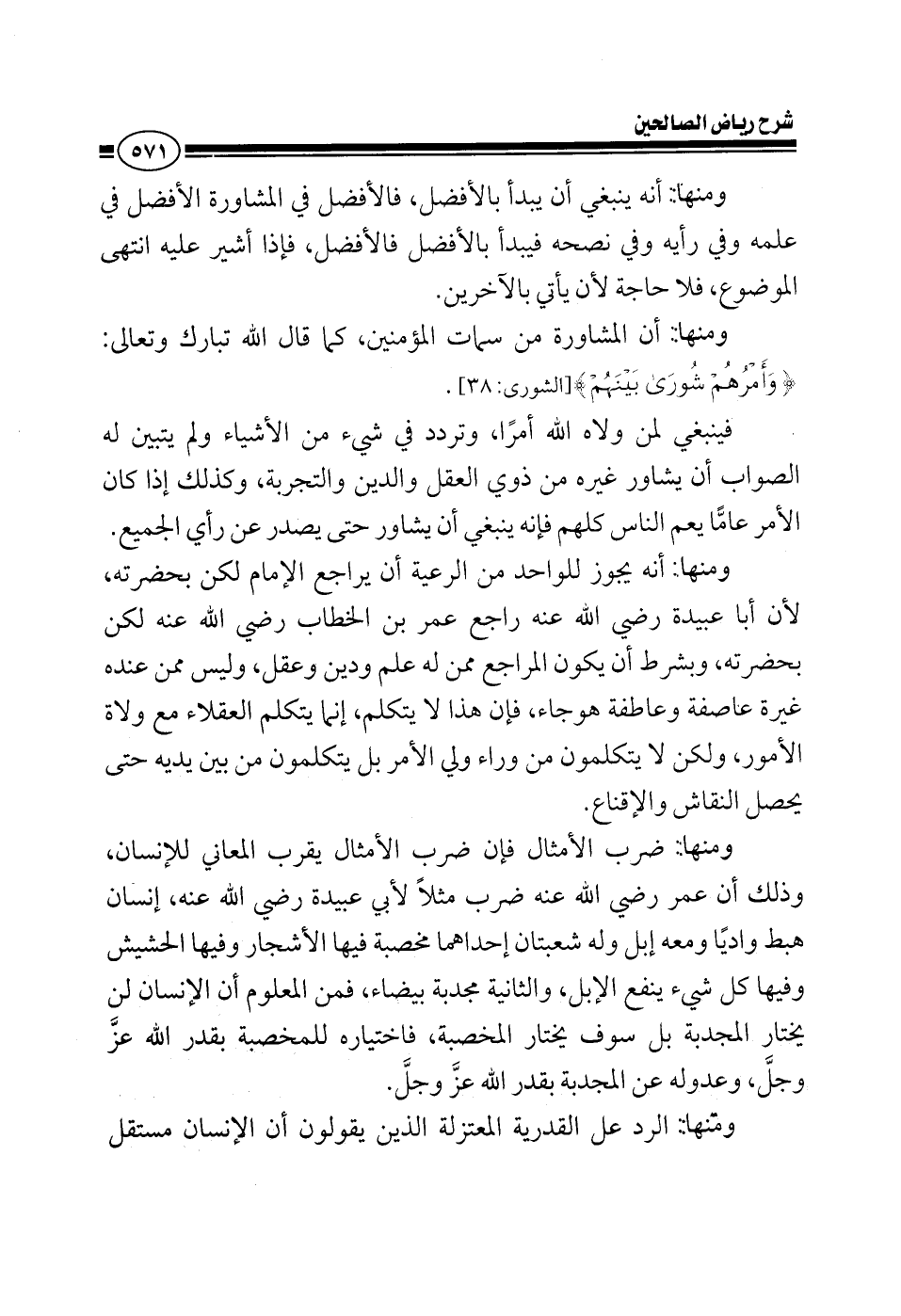 ومنها أنه ينبغي أن يبدأ بالأفضل فالأفضل في المشاورة الأفضل في علمه وفي رأيه وفي لطفه يبدأ بالأفضل فالأفضل فإذا أشير عليه انتهى الموضوع ما حاجة لأن يأتي بالآخرين وإلا أتى بالآخرين الذين هم دونهم ومنها أن المشاورة من سمات المؤمنين كما قال الله تبارك وتعالى {وأمرهم شورى بينهم} فينبغي لمن ولاه الله أمرا وتردد في شيء من الأشياء ولم يتبين له الصواب أن يشاور غيره من ذوي العقل والدين والتجربة وكذلك إذا كان الأمر عاما يعم الناس كلهم فإنه ينبغي أن يشاور حتى يصدر عن رأي الجميع ومنها أنه يجوز للواحد من الرعية أن يراجع الإمام لكن بحضرته لأن أبا عبيدة راجع عمر بن الخطاب رضي الله عنه لكن بحضرته وبشرط أن يكون المراجع ممن له علم ودين وعقل ليس ممن عنده غيرة عاصفة وعاطفة هوجاء فإن هذا لا يتكلم إنما يتكلم العقلاء هم الذين يتكلمون مع ولاة الأمور ولكن لا يتكلمون من وراء ولي الأمر بل يتكلمون من بين يديه حتى يحصل النقاش والإقناع ومنها ضرب الأمثال فإن ضرب الأمثال يقرب المعاني للإنسان وذلك أن عمر رضي الله عنه ضرب مثلا لأبي عبيدة إنسان هبط واديا ومعه إبل وله شعبتان إحداهما مخصبة فيها الأشجار وفيها الحشيش وفيها كل شيء ينفع الإبل والثانية مجدبة بيضاء فمن المعلوم أن الإنسان لن يختار المجدبة سوف يختار المخصبة فاختياره للمخصبة بقدر الله عز وجل وعدوله عن المجدبة بقدر الله عز وجل ومنها الرد على القدرية المعتزلة الذين يقولون إن الإنسان مستقل
