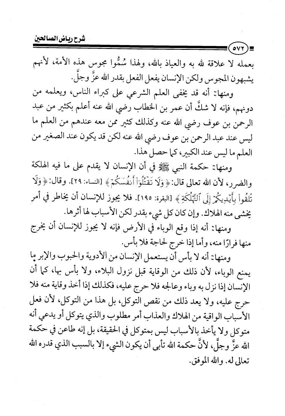 بعمله لا علاقة لله به والعياذ بالله ولهذا سموا مجوس هذه الأمة لأنهم يشبهون المجوس ولكن الإنسان يفعل الفعل بقدر الله عز وجل ومنها أنه قد يخفى العلم الشرعي على كبراء الناس ويعلمه من دونهم فإنه لا شك أن عمر بن الخطاب رضي الله عنه أعلم بكثير من عبد الرحمن بن عوف وكذلك كثير ممن معه عندهم من العلم ما ليس عند عبد الرحمن بن عوف لكن قد يكون عند الصغير من العلم ما ليس عند الكبير كما حصل هذا ومنها حكمة النبي صلى الله عليه وسلم في أن الإنسان لا يقدم على ما فيه الهلكة والضرر لأن الله تعالى قال {ولا تقتلوا أنفسكم} وقال {ولا تلقوا بأيديكم إلى التهلكة} فلا يجوز للإنسان أن يخاطر في أمر يخشى منه الهلاك وإن كان كل شيء بقدر لكن الأسباب لها أثرها ومنها أنه إذا وقع الوباء في الأرض فإنه لا يجوز للإنسان أن يخرج منها فرارا منه وأما إذا خرج لحاجة فلا بأس ومنها أنه لا بأس أن يستعمل الإنسان من الأدوية والحبوب والإبر ما يمنع الوباء لأن ذلك من الوقاية قبل نزول البلاء ولا بأس بها كما أن الإنسان إذا نزل به وباء وعالجه فلا حرج عليه فكذلك إذا أخذ وقاية منه فلا حرج عليه ولا يعد ذلك من نقص التوكل بل هذا من التوكل لأن فعل الأسباب الواقية من الهلاك والعذاب أمر مطلوب والذي يتوكل أو يدعي أنه متوكل ولا يأخذ بالأسباب ليس بمتوكل في الحقيقة بل إنه طاعن في حكمة الله عز وجل لأن حكمة الله تأبى أن يكون الشيء إلا بالسبب الذي قدره الله تعالى له والله الموفق