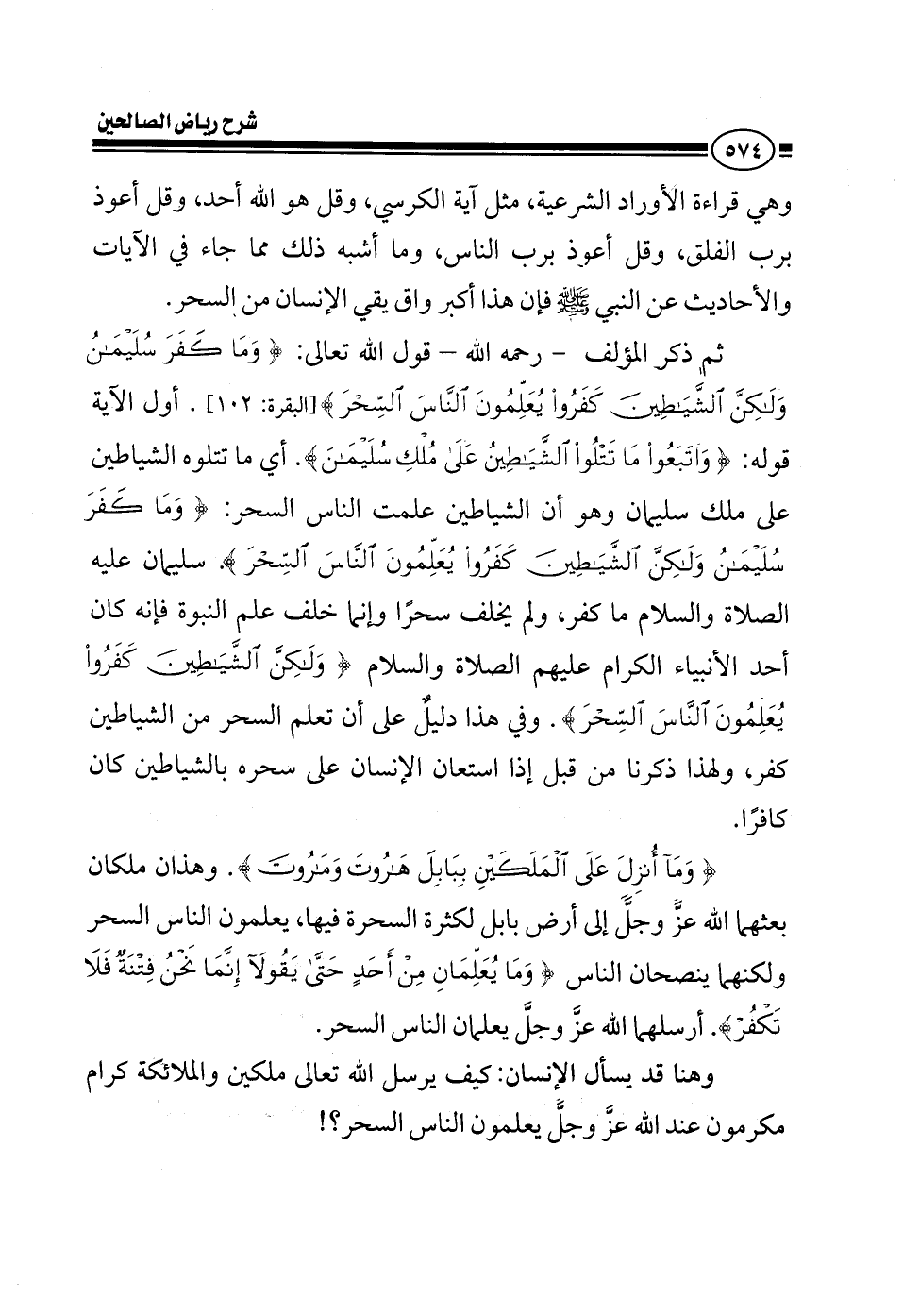 وهي قراءة الأوراد الشرعية مثل آية الكرسي قل هو الله أحد قل أعوذ برب الفلق قل أعوذ برب الناس وما أشبه ذلك مما جاء في الآيات والأحاديث عن النبي صلى الله عليه وسلم فإن هذا أكبر واق يقي الإنسان من السحر ثم ذكر المؤلف رحمه الله قول الله تعالى وما كفر سليمان ولكن الشياطين كفروا أول الآية قوله {واتبعوا ما تتلو الشياطين على ملك سليمان} أي ما تتبعه على ملك سليمان وهو أن الشياطين علمت الناس السحر {وما كفر سليمان ولكن الشياطين كفروا يعلمون الناس السحر} سليمان عليه الصلاة والسلام ما كفر ولم يخلف سحرا وإنما خلف علم النبوة فإنه كان أحد الأنبياء الكرام عليهم الصلاة والسلام {ولكن الشياطين كفروا يعلمون الناس السحر} وفي هذا دليل على أن السحر تعلمه من الشياطين كفر ولهذا قلنا قبل قليل إذا استعان الإنسان على سحره بالشياطين كان كافرا {وما أنزل على الملكين ببابل هاروت وماروت} وهذان ملكان بعثهما الله عز وجل إلى أرض بابل لكثرة السحرة فيها يعلمون الناس السحر ولكنهما ينصحان الناس {وما يعلمان من أحد حتى يقولا إنما نحن فتنة فلا تكفر} أرسلهما الله عز وجل يعلمان الناس السحر وهنا قد يسأل الإنسان كيف يرسل الله تعالى ملكين والملائكة كرام مكرمون عند الله عز وجل كيف يرسلهم يعلمون الناس السحر