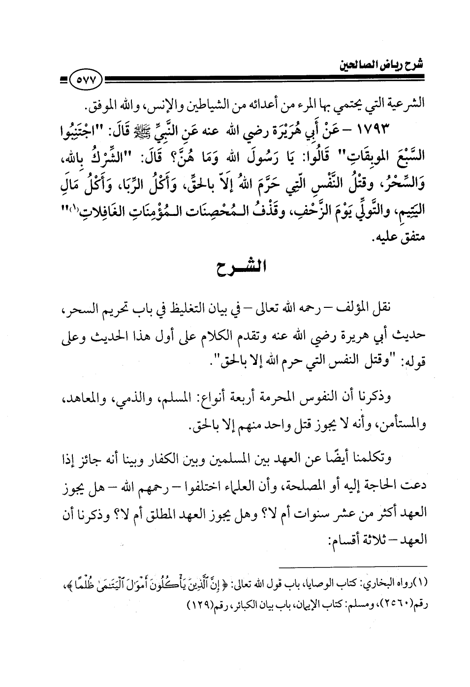 1793 - وعن أبي هريرة رضي الله عنه عن النبي صلى الله عليه وسلم قال: اجتنبوا السبع الموبقات قالوا يا رسول الله وما هن؟ قال الشرك بالله والسحر وقتل النفس التي حرم الله إلا بالحق وأكل الربا وأكل مال اليتيم والتولي يوم الزحف وقذف المحصنات المؤمنات الغافلات متفق عليه