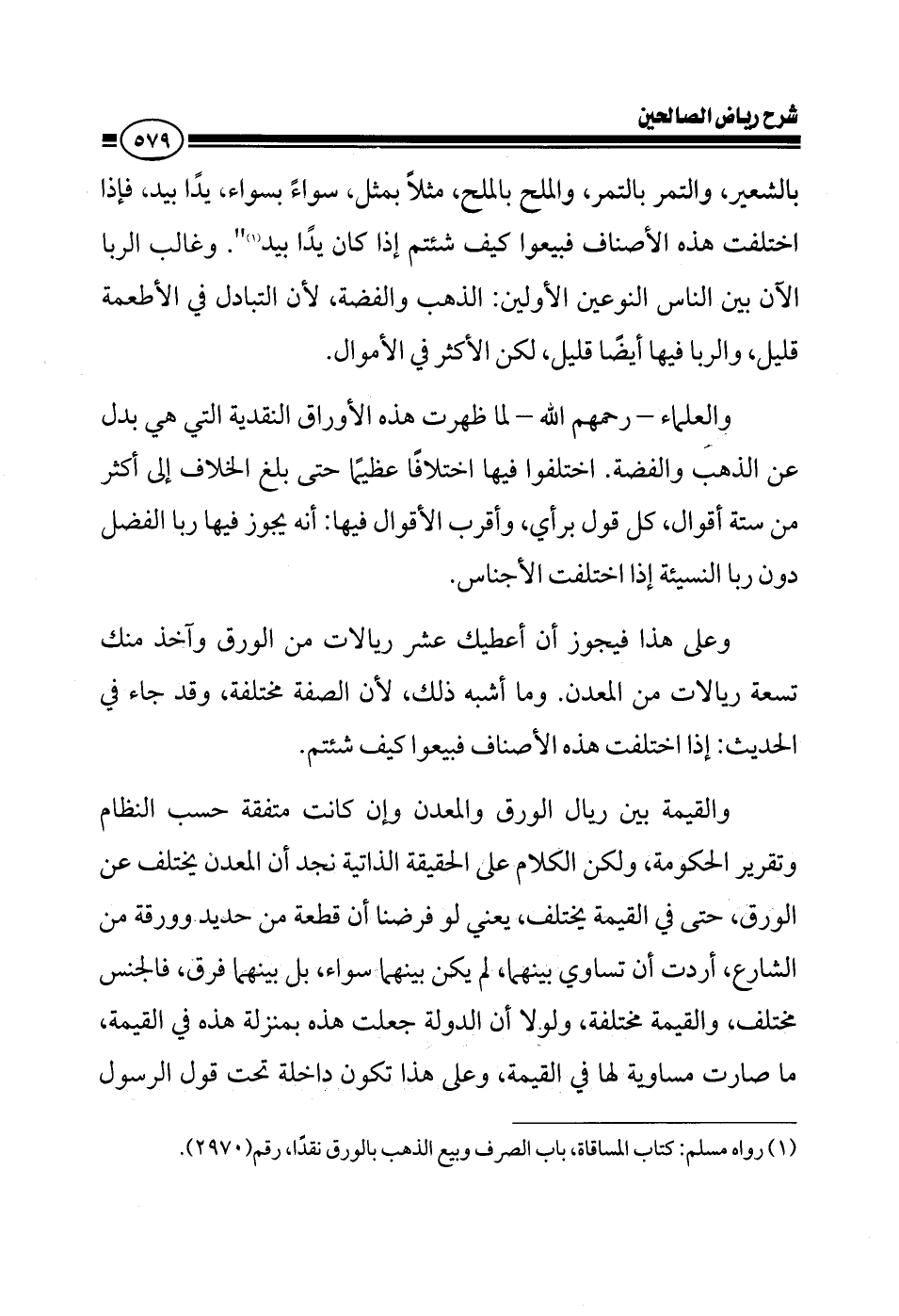 بالشعير والتمر بالتمر والملح بالملح مثلا بمثل سواء بسواء يدا بيد فإذا اختلفت هذه الأصناف فبيعوا كيف شئتم إذا كان يدا بيد وغالب الربا الآن بين الناس النوعان الأولان الذهب والفضة لأن الأطعمة التبادل فيها قليل والربا فيها أيضا قليل لكن الأكثر في الأموال والعلماء رحمهم الله لما ظهرت هذه الأوراق النقدية التي هي بدل عن الذهب والفضة اختلفوا فيها اختلافا عظيما حتى بلغ الخلاف إلى أكثر من ستة أقوال كل يقول برأي وأقرب الأقوال فيها أنه يجوز فيها ربا الفضل ولا يجوز ربا النسيئة بمعنى أنه يجوز فيها ربا الفضل دون ربا النسيئة إذا اختلفت الأجناس وعلى ذلك فيجوز أن أعطيك عشرة ريالات بالورق وأخذ منك تسعة ريالات بالحديد وما أشبه ذلك لأن الصفة مختلفة وقد جاء في الحديث إذا اختلفت هذه الأصناف فبيعوا كيف شئتم والقيمة وإن كانت متفقة حسب النظام وتقرير الحكومة لكن الكلام على الحقيقة الذاتية نجد أن الحديد يختلف عن القرطاس حتى في القيمة يختلف يعني لو فرضنا أن قطعة من حديد وورقة من الشارع أردت أن تساوي بينهما لم يكن بينهما سواء بل بينهما فرق فالجنس مختلف والقيمة مختلفة ولولا أن الحكومة جعلت هذه بمنزلة هذه في القيمة فما صارت مساوية لها في القيمة وعلى هذا تكون داخلة تحت قول الرسول